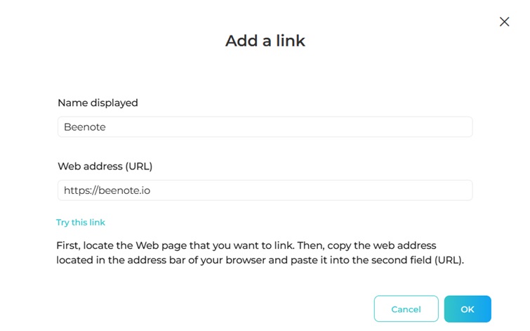 . Add the information found in the window: Name displayed and Web address (URL). It is important to test the link to make sure it is functional. Then, press Ok.
