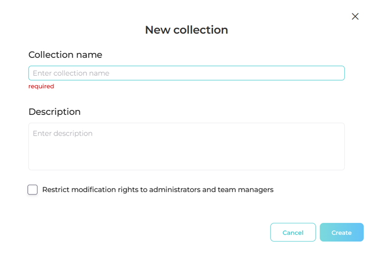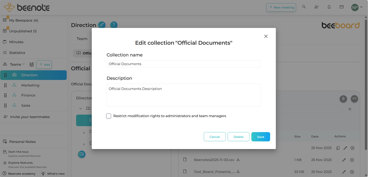 Thereafter, you will be able to modify the name of this collection, the description, check or uncheck the box restricting editing rights to administrators and team leaders and save the changes.