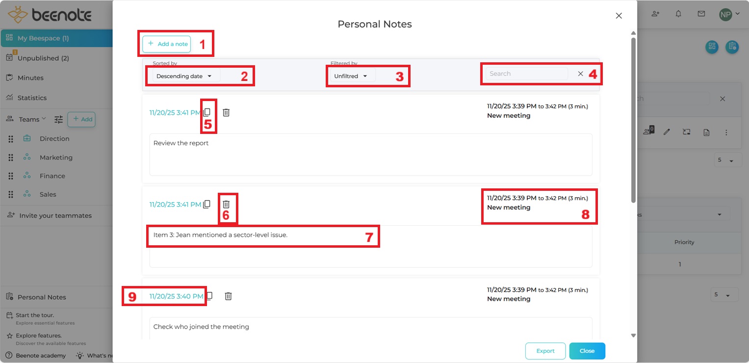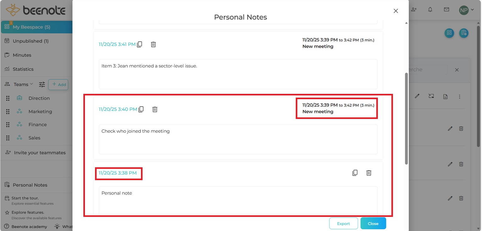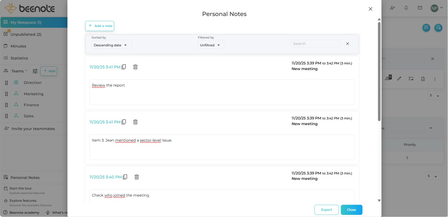 Important: It has two types of notes. Personal notes created from Beespace that are not associated with a meeting and personal notes created in a meeting.