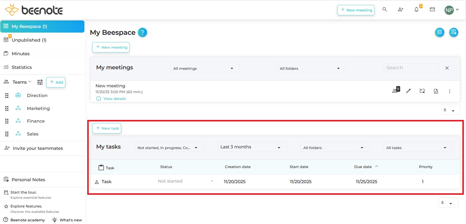 When you are in your Beespace, your task board is in the bottom section. This is where you will find all your personal, tracked, and assigned tasks.