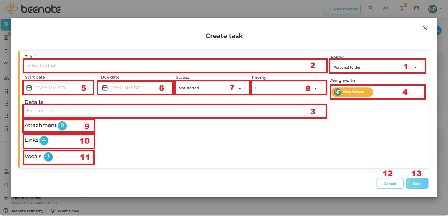 Note: Also, the personal file is reserved only for you. As the name suggests, this folder is personal, meaning that no one else has access to it. In order to assign a task to another person or to assign an observer, the task must be linked to any other folder than the personal folder.