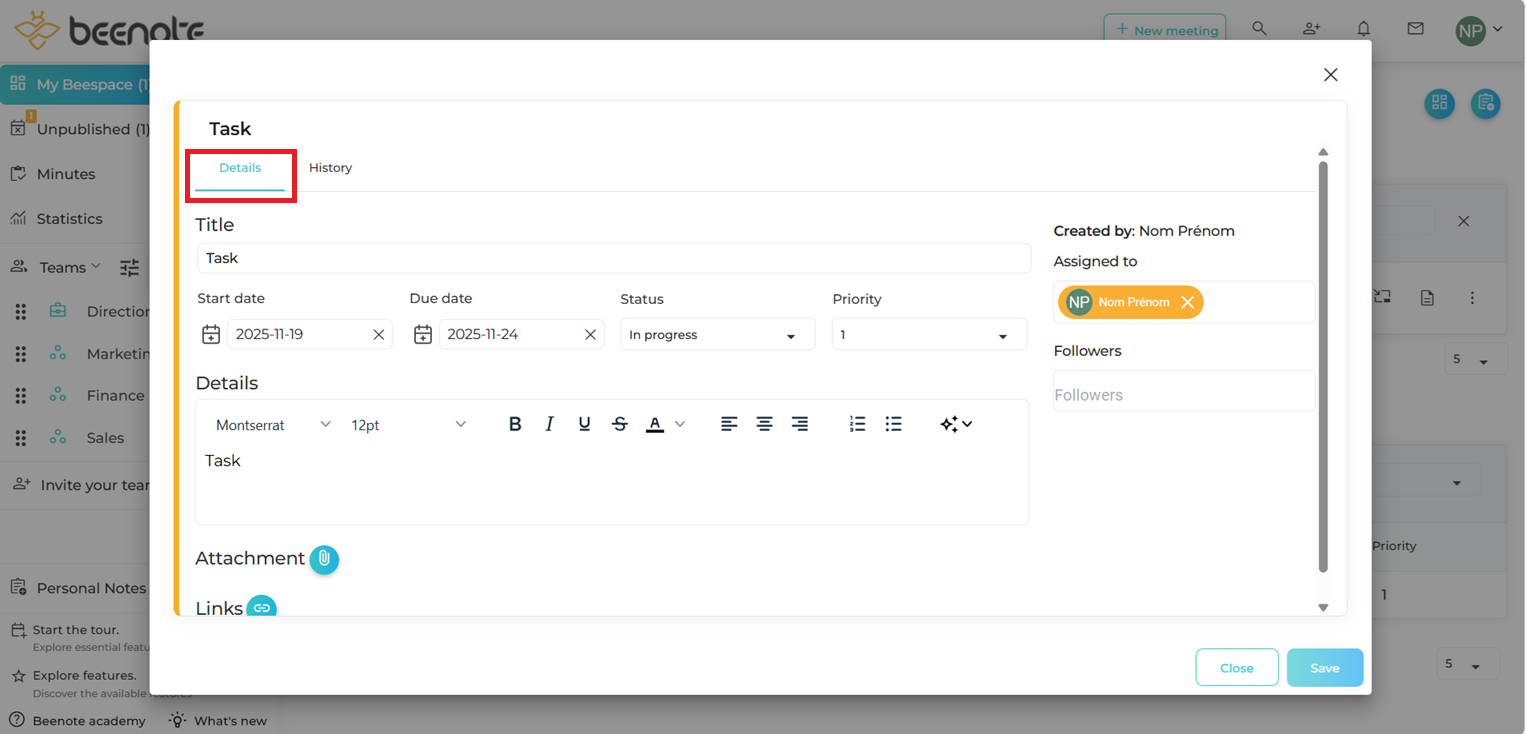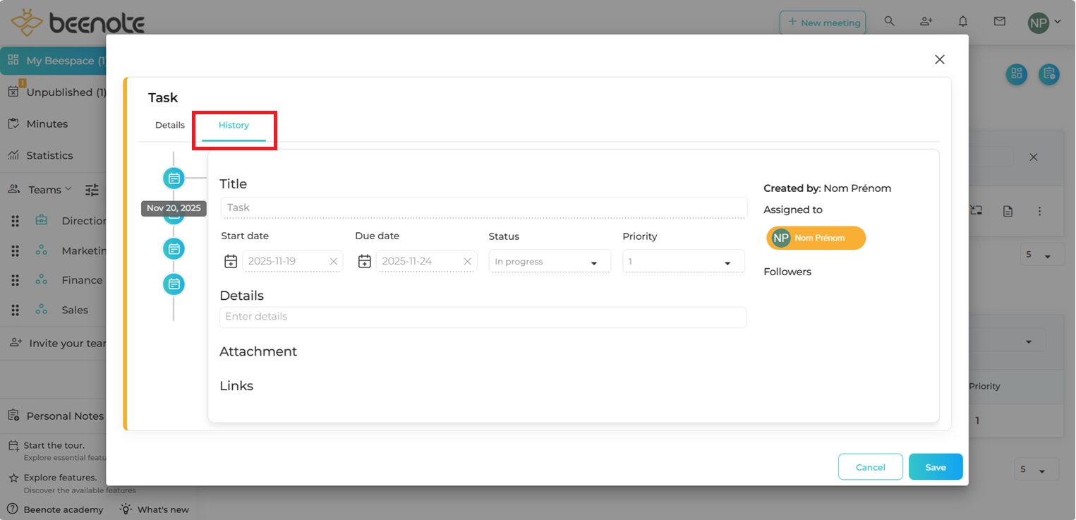 You will be able to see the evolution of the task since the historic of the modifications will be kept. Therefore, after modifying a task, there will be a new section will be added in the History tab. All the modifications will be accessible and it will be possible to consult previous versions of the assigned tasks.