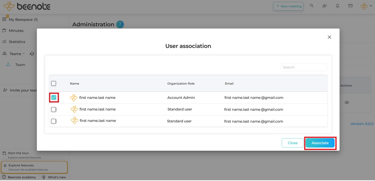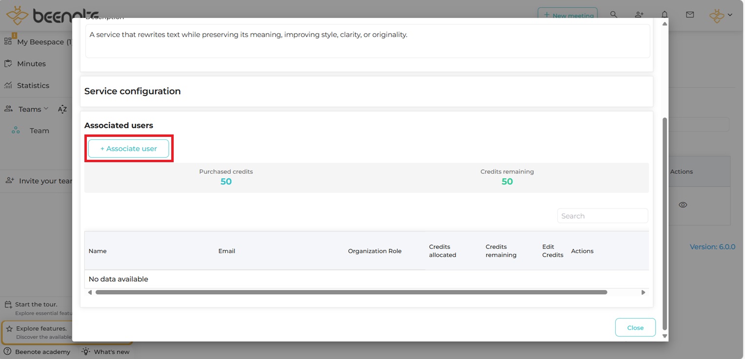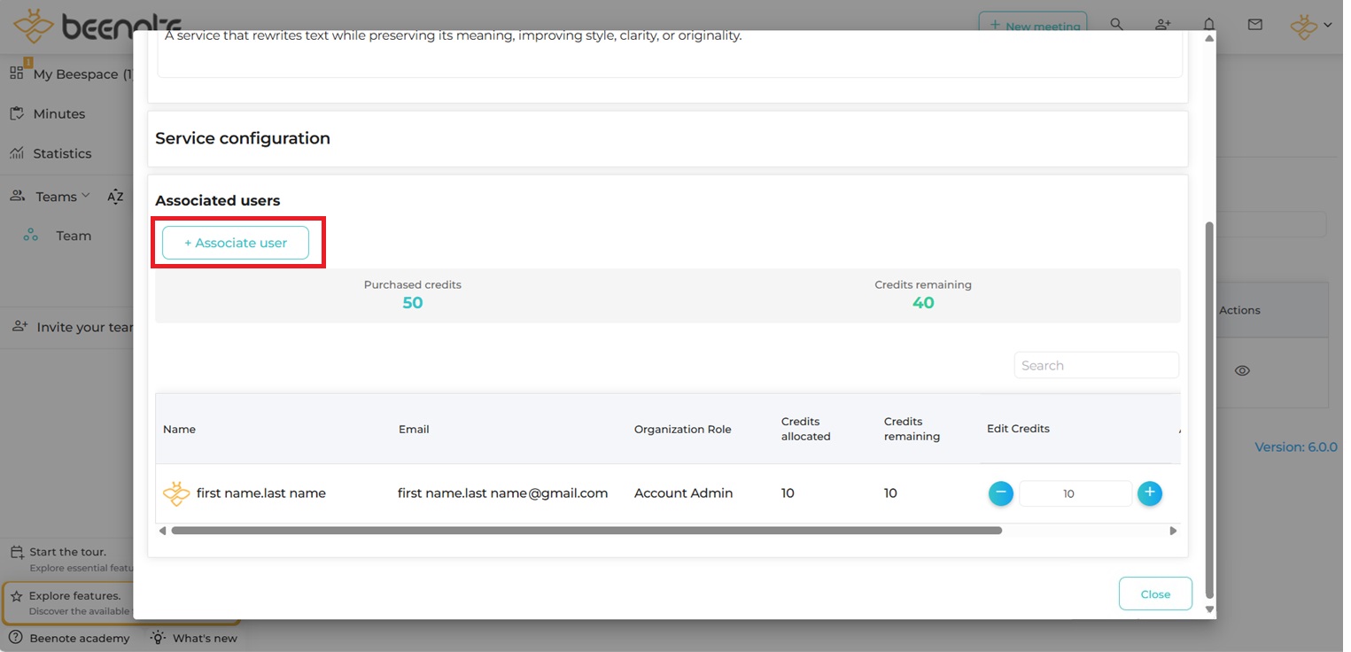 6. At the bottom of the window, click Associate user to select which users can test this AI feature.
