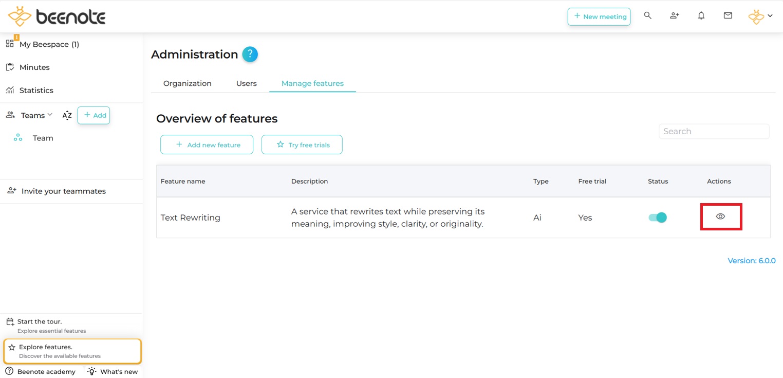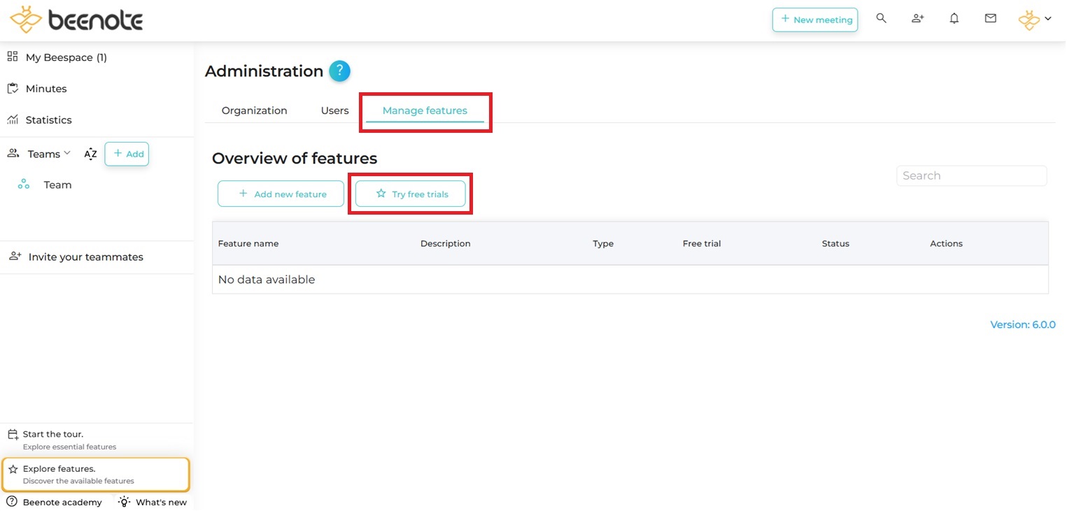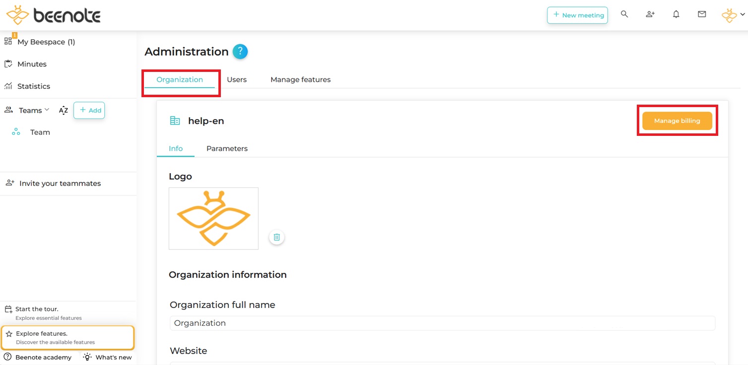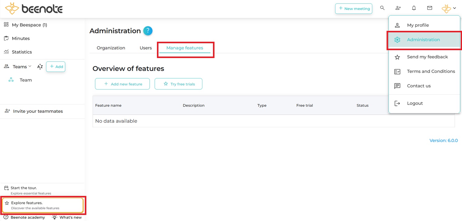 1. When you are in your Beespace, go to the right side of your page and scroll down the drop-down menu, then press Administration or click directly on the Explore features menu.