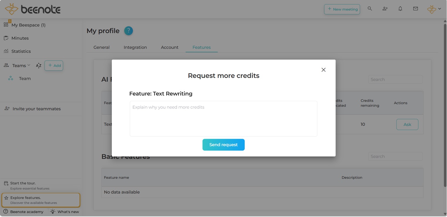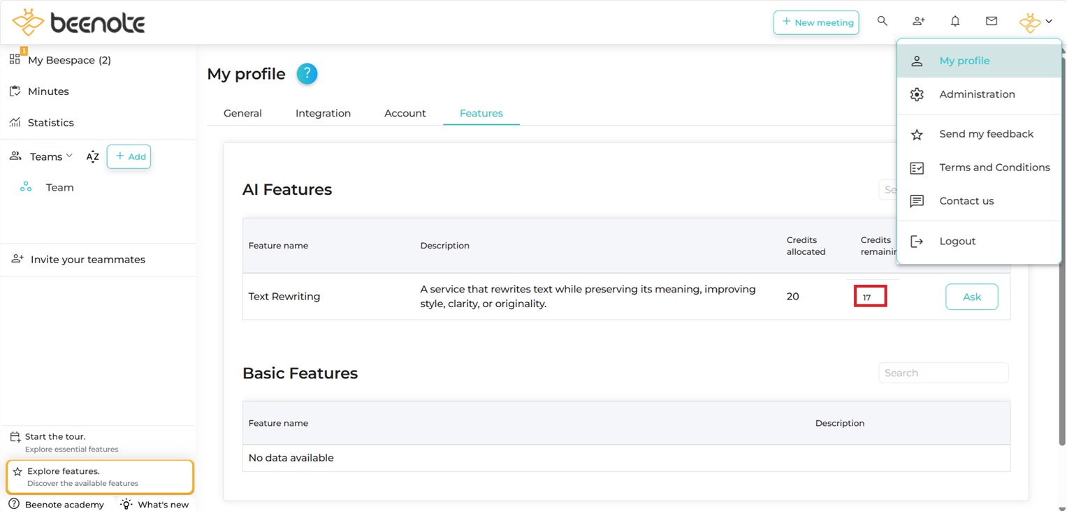 5. Finally, go back to My Profile and click on Features tab to check the remaining credits for the AI feature after each use.