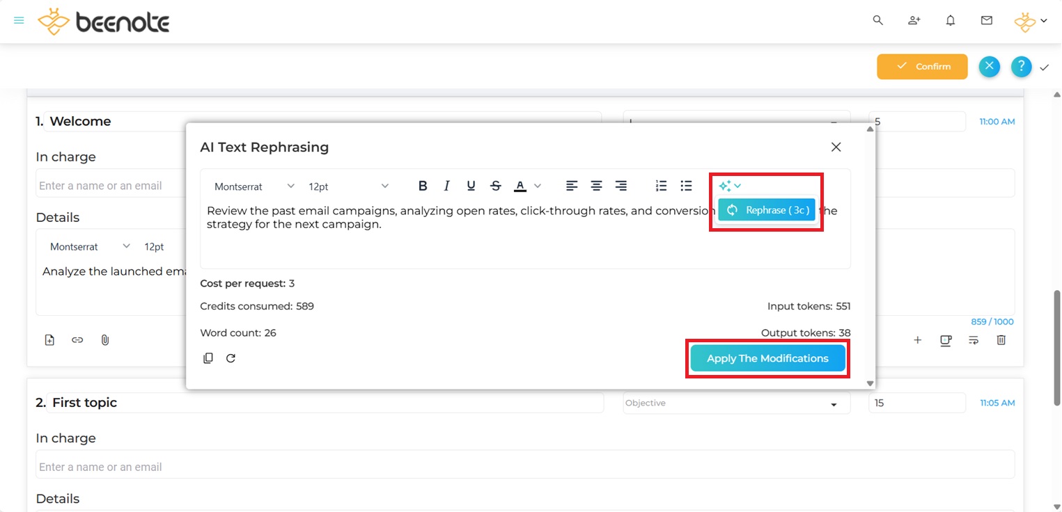 Simply enter your text, then click on AI Tools icon and select Rephrase button. Your text will then be rewritten.