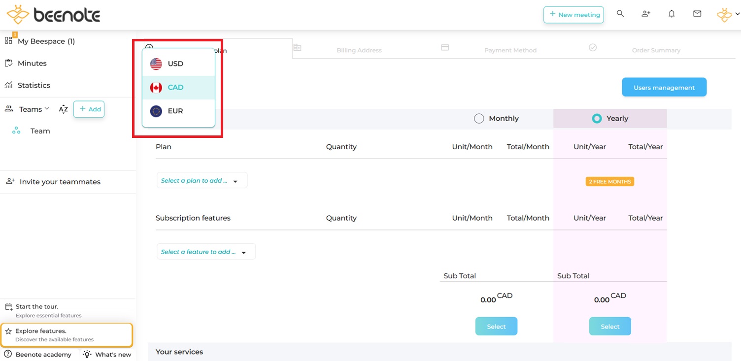 In this case, Beenote selects a default currency, but you can change it according to your needs: CAD (Canadian), USD (American), or EUR (European).