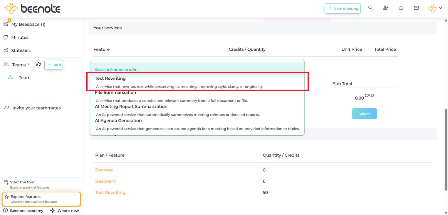 3. In Select a Plan tab, click on Select a feature to add and choose the AI feature you want to purchase.