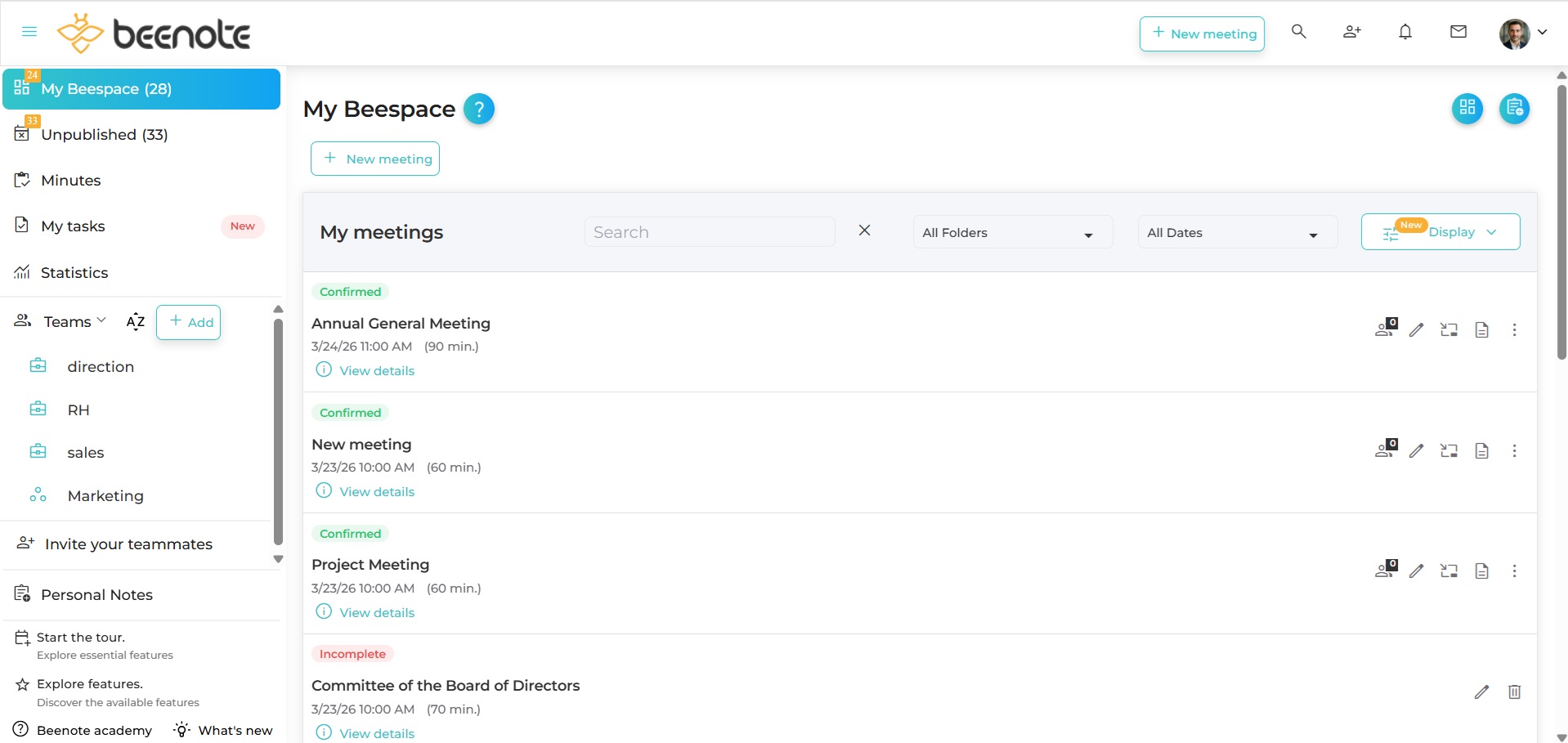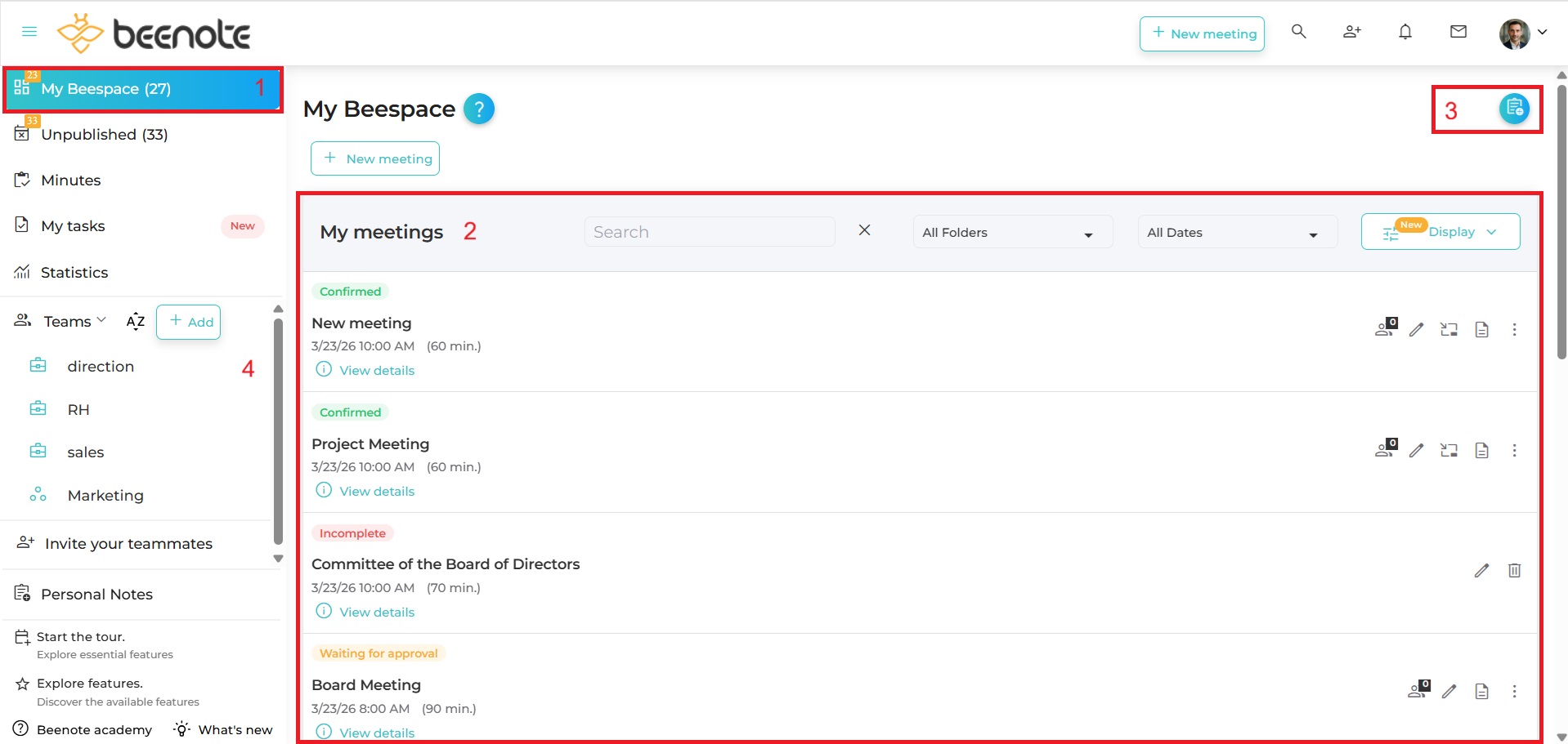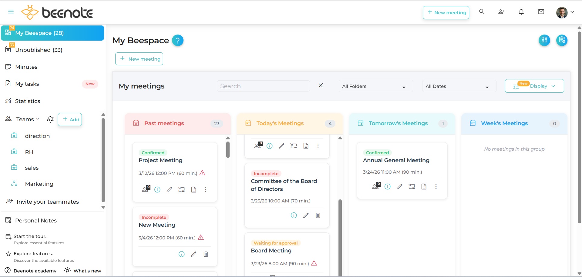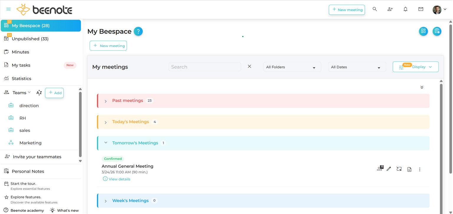 The Beespace is your personal dashboard for managing your meetings. This tool allows you to have a good overview of your governance management.