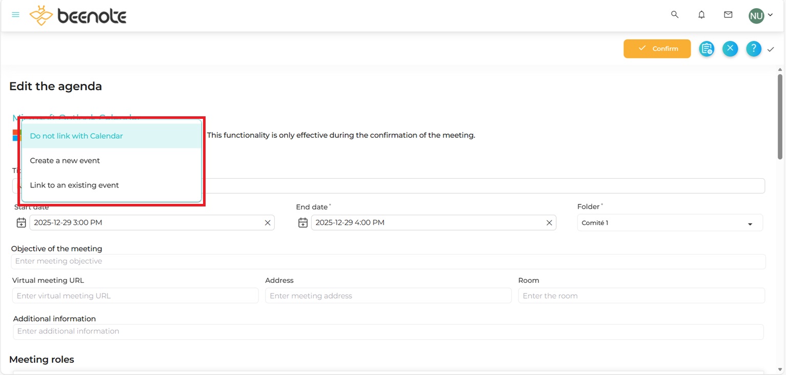 If you want to associate your agenda with an existing event in your Outlook calendar, you need to select Link to an existing event and choose the event to link.