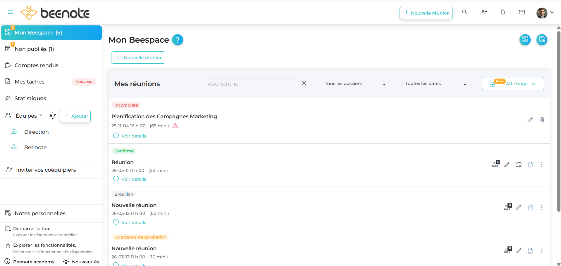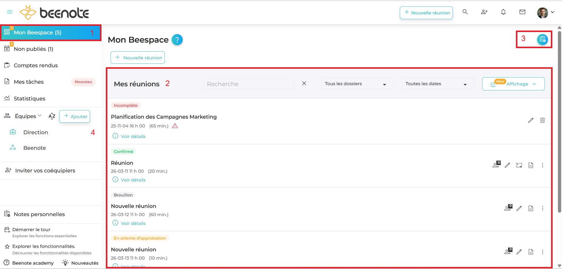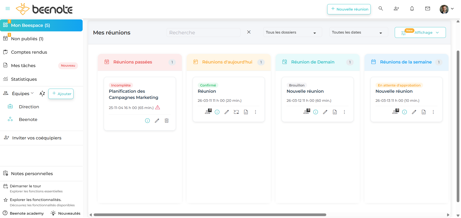 Les fonctions qui se retrouvent dans le Beespace vous permettent de voir rapidement les réunions, les équipes, la liste des tâches à accomplir ainsi que l’ensemble des notes personnelles.