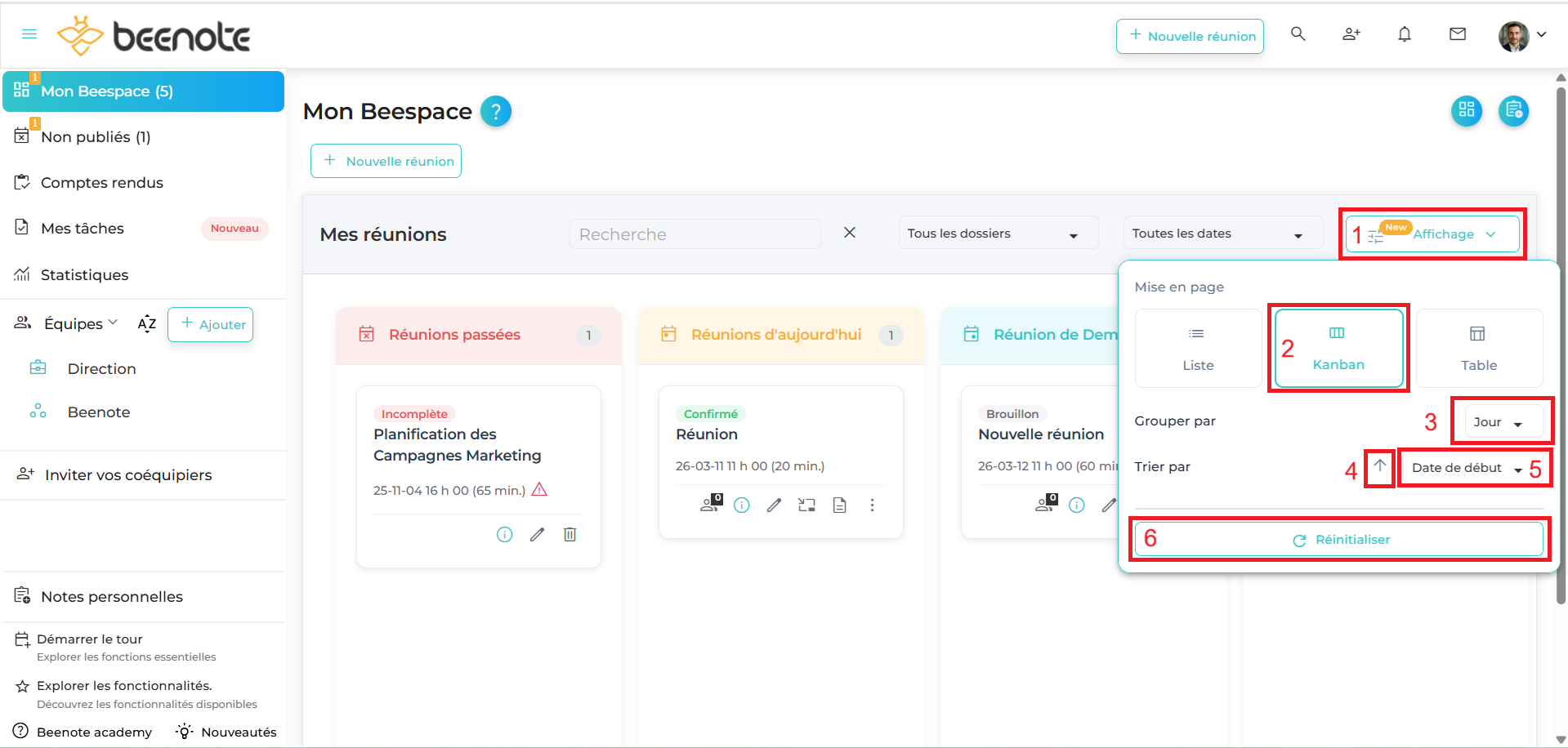 (3) La liste de Grouper par: Permet de regrouper les réunions selon statut ou jour.