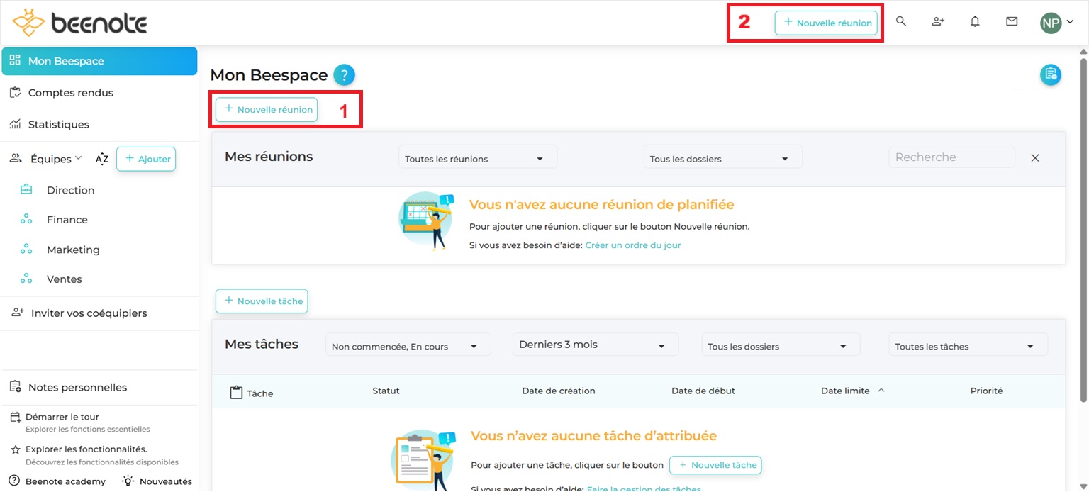 Pour commencer, afin de créer un ordre du jour vous devez sélectionnez le bouton ​ en haut de Mes réunions lorsque vous êtes dans votre Beespace (1) ou dans la barre du haut de votre page (2). Celle-ci est toujours disponible quand vous naviguez dans Beenote.
