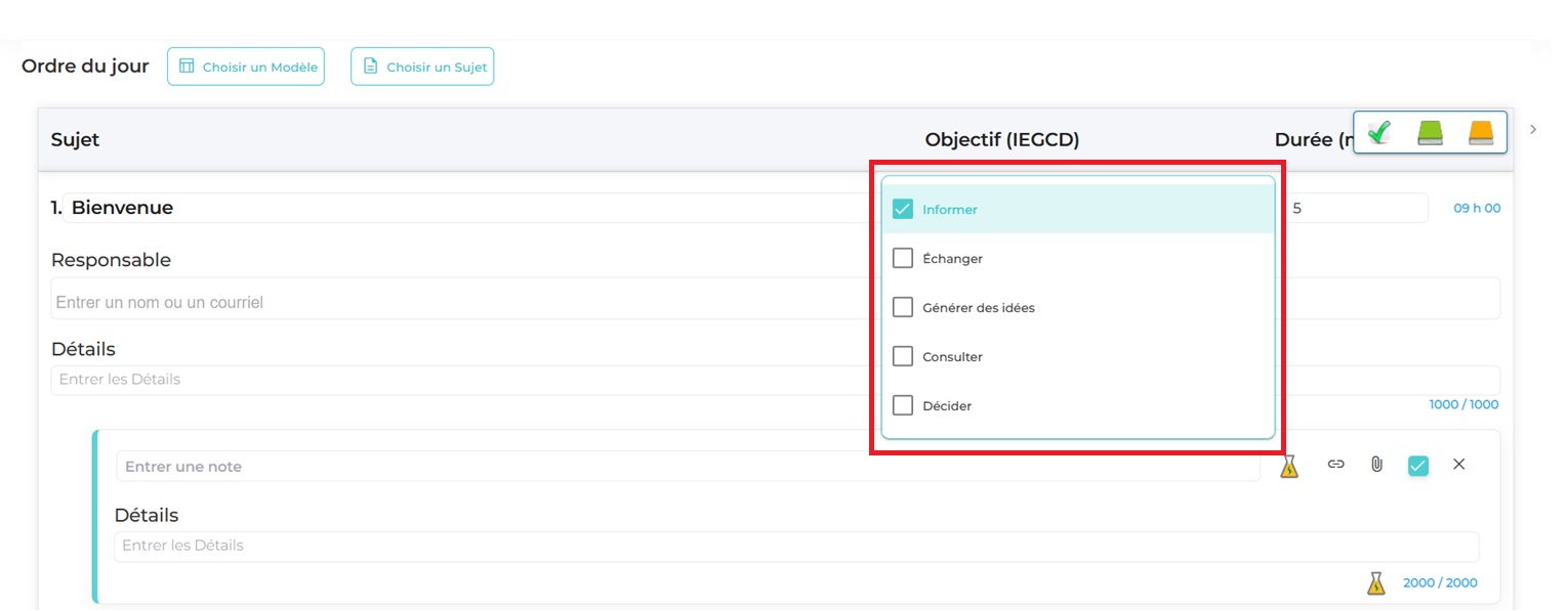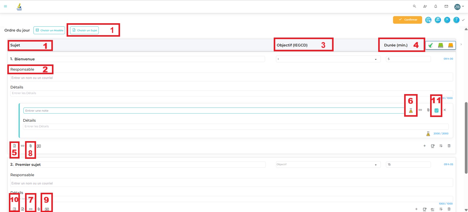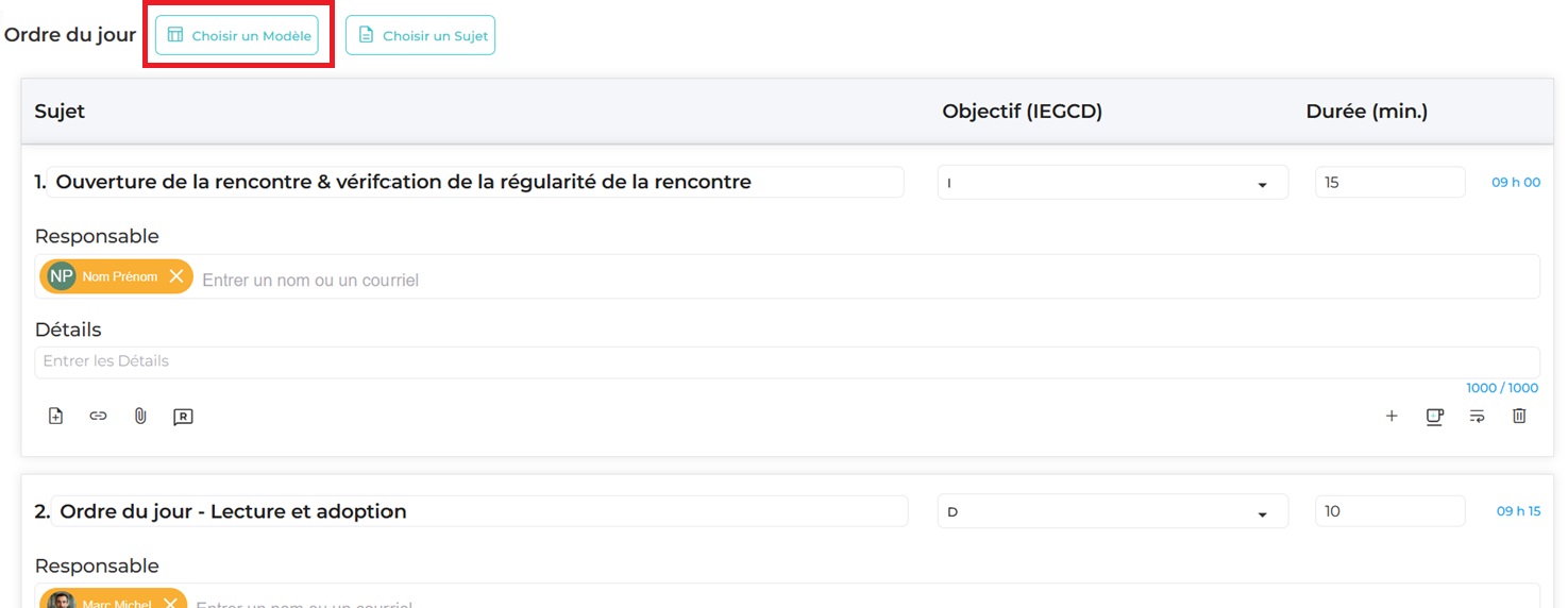 Note: Seulement le leader et les partenaires peuvent éditer l’ordre du jour.