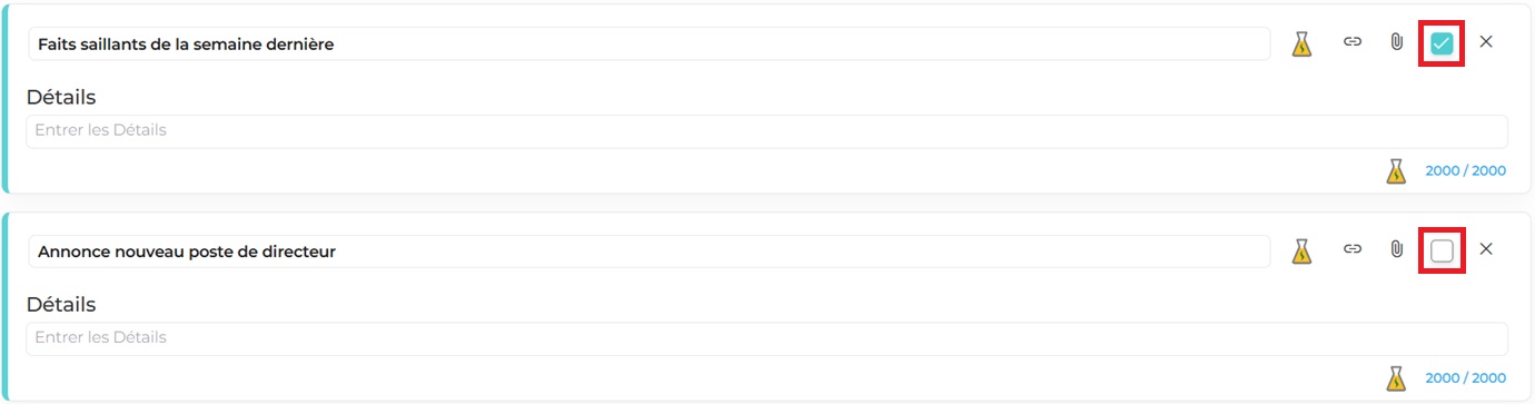 Avec le mode secrétaire activé et lorsqu’une case a été décochée, le contenu reste privé lors de la réunion, donc exclusif aux secrétaires. Ces personnes avec ce rôle peuvent rendre cette note ou résolution visible à tous.