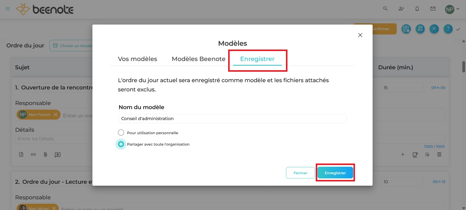 Votre ordre du jour est maintenant terminé. Vous pouvez enregistrer votre propre modèle, le mettre en mode brouillon pour que les autres participants puissent inscrire leurs points ou confirmer l’ordre du jour.