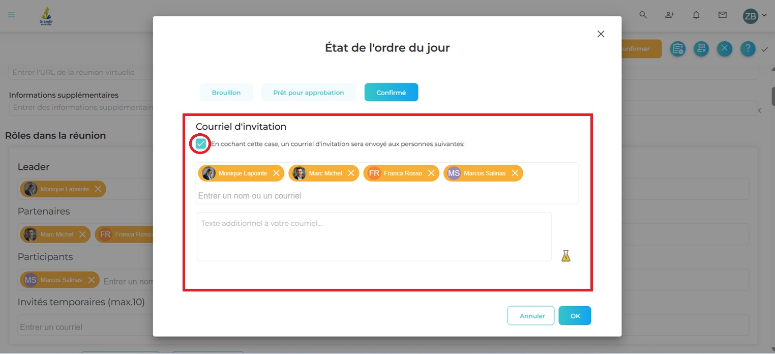 À la fin de la création de l’ordre du jour et de la préparation de la réunion, toutes ces personnes recevront un courriel d’invitation avec deux éléments importants: