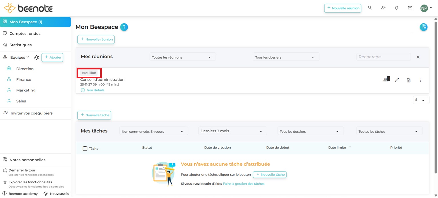 Une fois votre ordre du jour enregistré, vous verrez son état, brouillon, en approbation ou confirmé, sur la réunion dans votre Beespace.