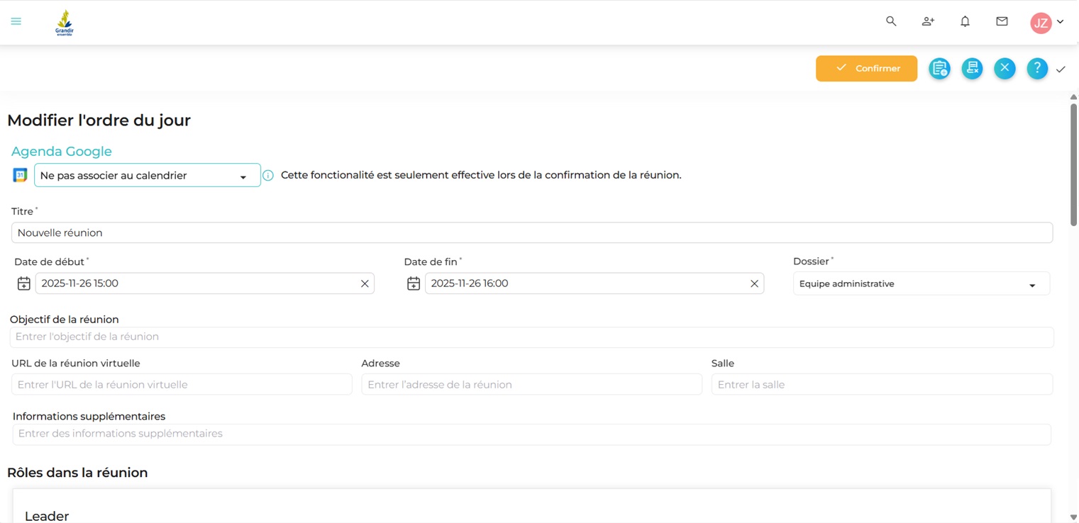 Normalement, celui qui rédige l’ordre du jour est le «Leader» (1). Or, vous pouvez toutefois changer ce rôle pour l’attribuer à une autre personne.