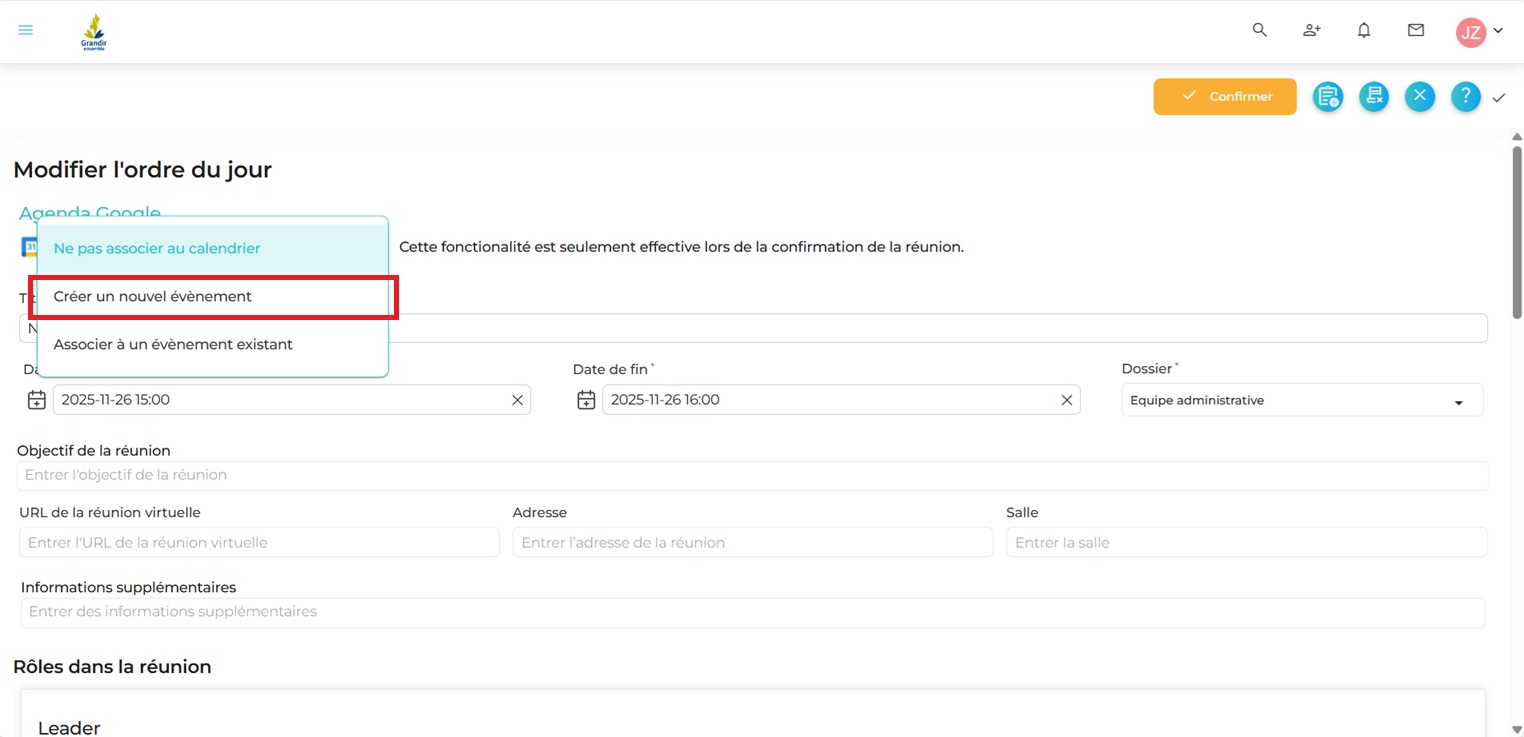 3. Pour associer la réunion à votre calendrier corporatif, vous devez cliquer sur le bouton Microsoft ou Google, puis sélectionner Créer un nouvel évènement