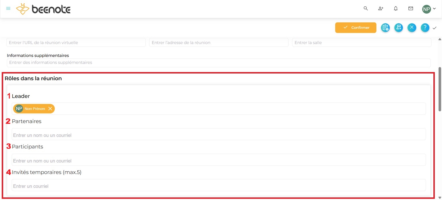Partenaires (2) : ce rôle aide le leader dans la réalisation des tâches lors de la réunion et possède les mêmes droits.