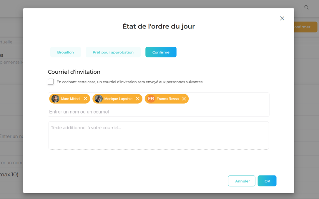 Une fenêtre s’affiche. Vous pouvez choisir l’état de l’ordre du jour en cliquant sur le bouton brouillon, prêt pour approbation ou confirmé.
