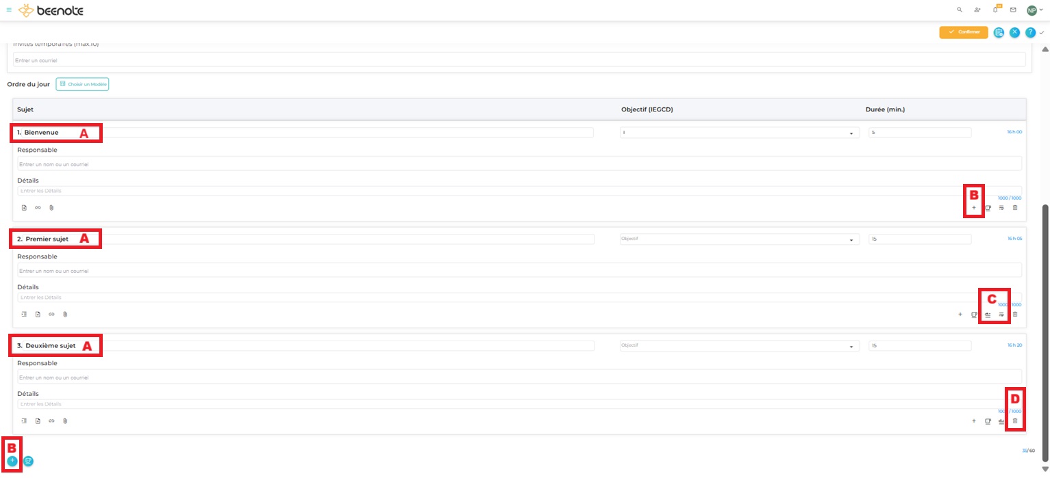 Par défaut, l’application Beenote crée 3 sujets (A). Facilement, vous pouvez en ajouter ou même en insérer entre 2 sujets (B). Aussi, vous avez la possibilité de les déplacer à votre convenance (C) et même d’en supprimer (D). De plus, la numérotation se fera automatiquement.