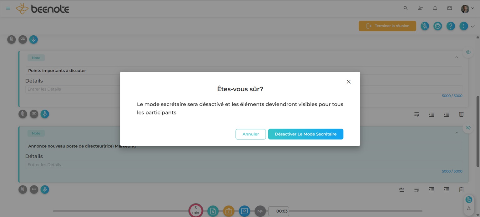 N.B: Seuls le leader ou les partenaires de la réunion peuvent activer ou désactiver le mode secrétaire