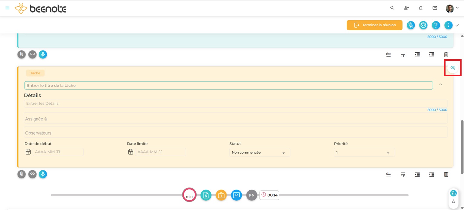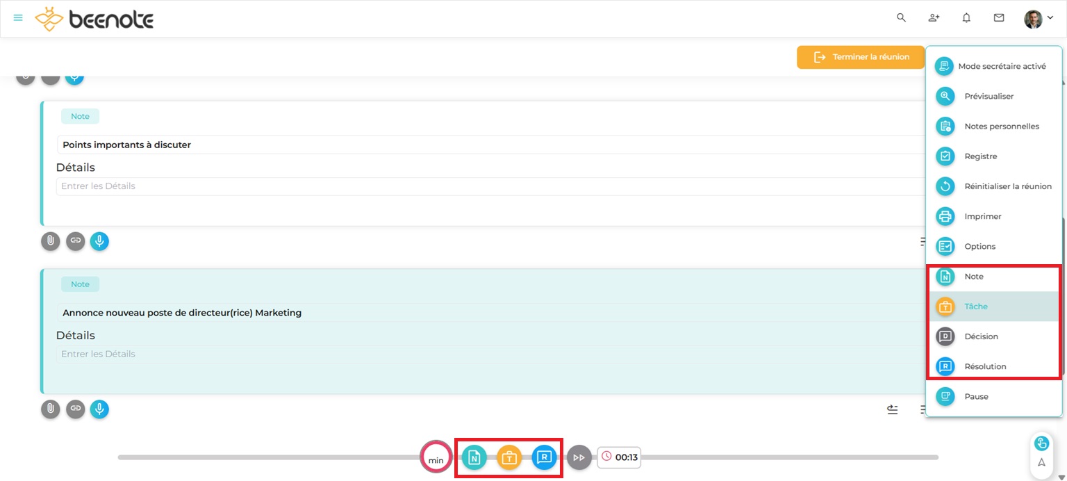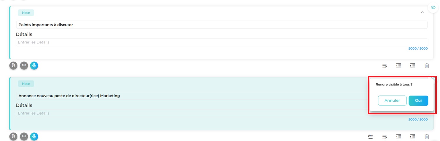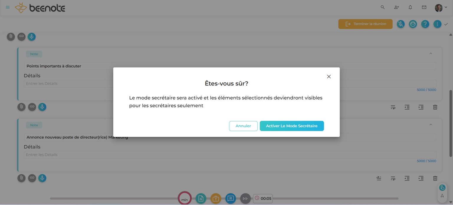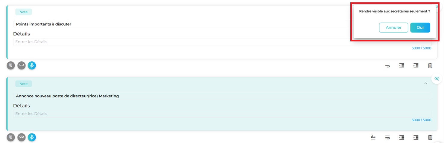 N.B: Lorsque le mode secrétaire est actif, les secrétaires pourront rendre privé ou visible le contenu durant la réunion.