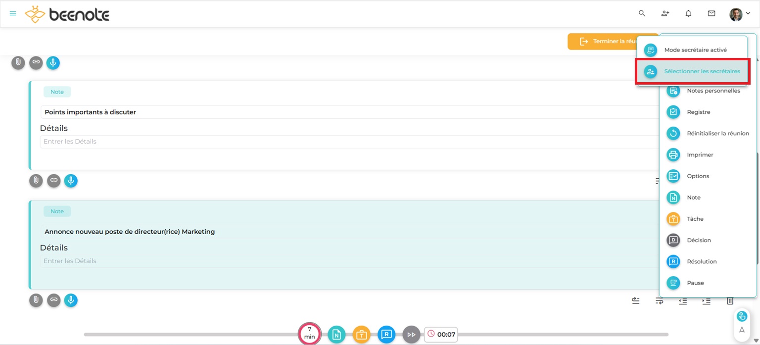 Toujours dans la barre en haut de l’ordre du jour, cliquez sur l’icône «…» puis dans le menu déroulant, cliquez sur Sélectionner les secrétaires.