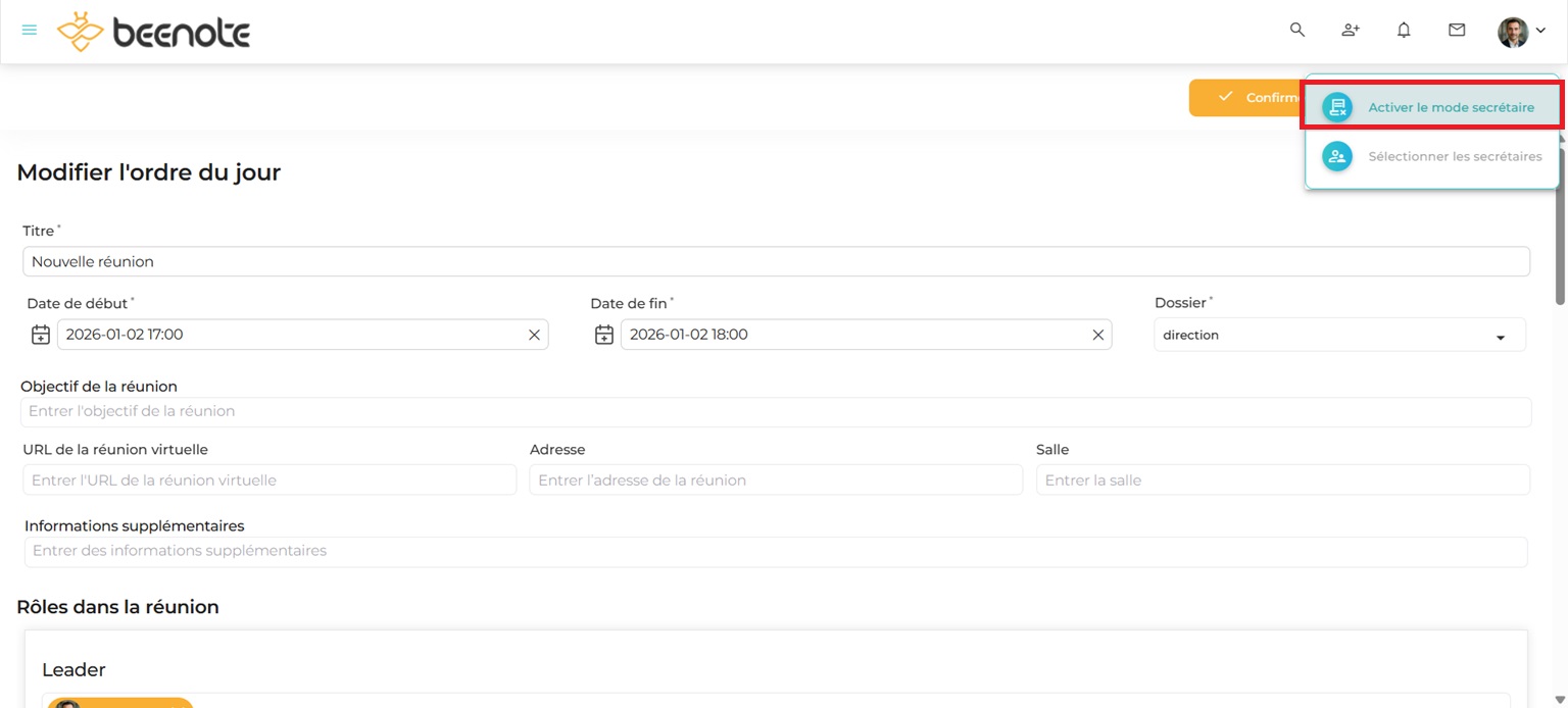 Le mode secrétaire peut être activé avant la réunion donc durant la planification de l’ordre du jour. Seules les personnes avec le rôle de leader et partenaire de la réunion peuvent déterminer cette fonction.