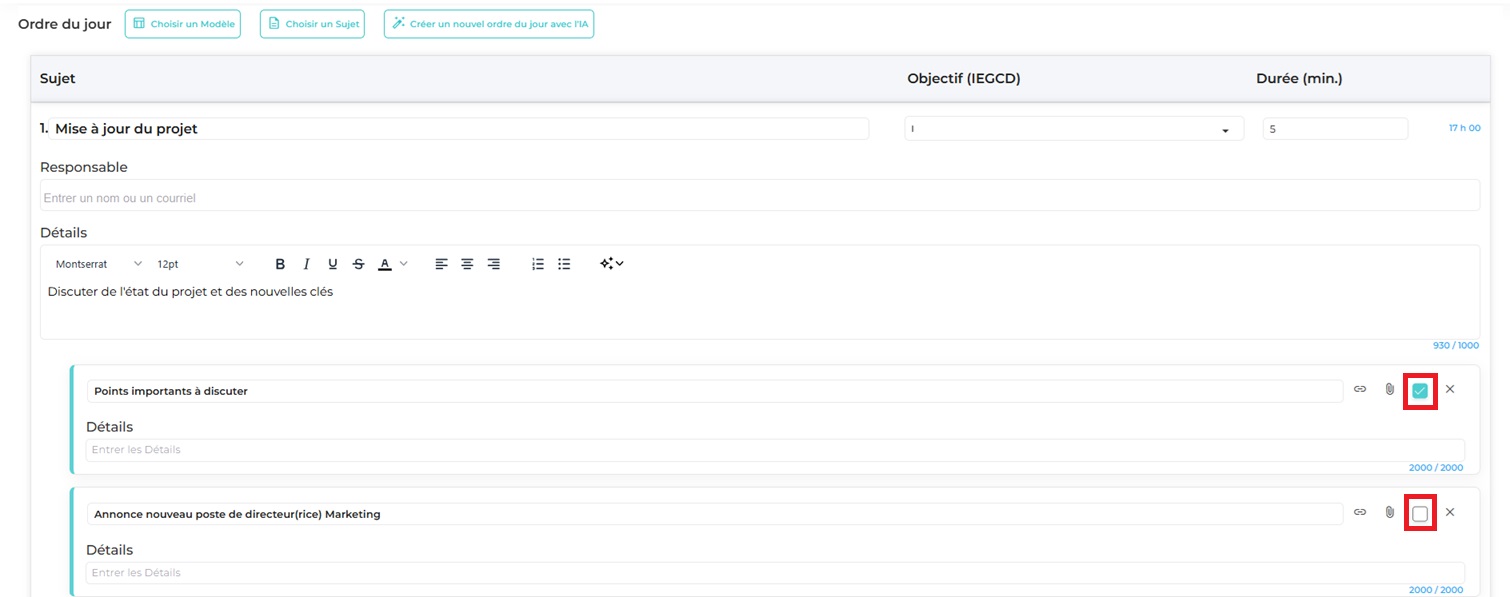 Une fois le contenu révisé, toutes les sections de l’ordre du jour pourront être intégrées ou non dans le compte rendu et donc disponible à tous.