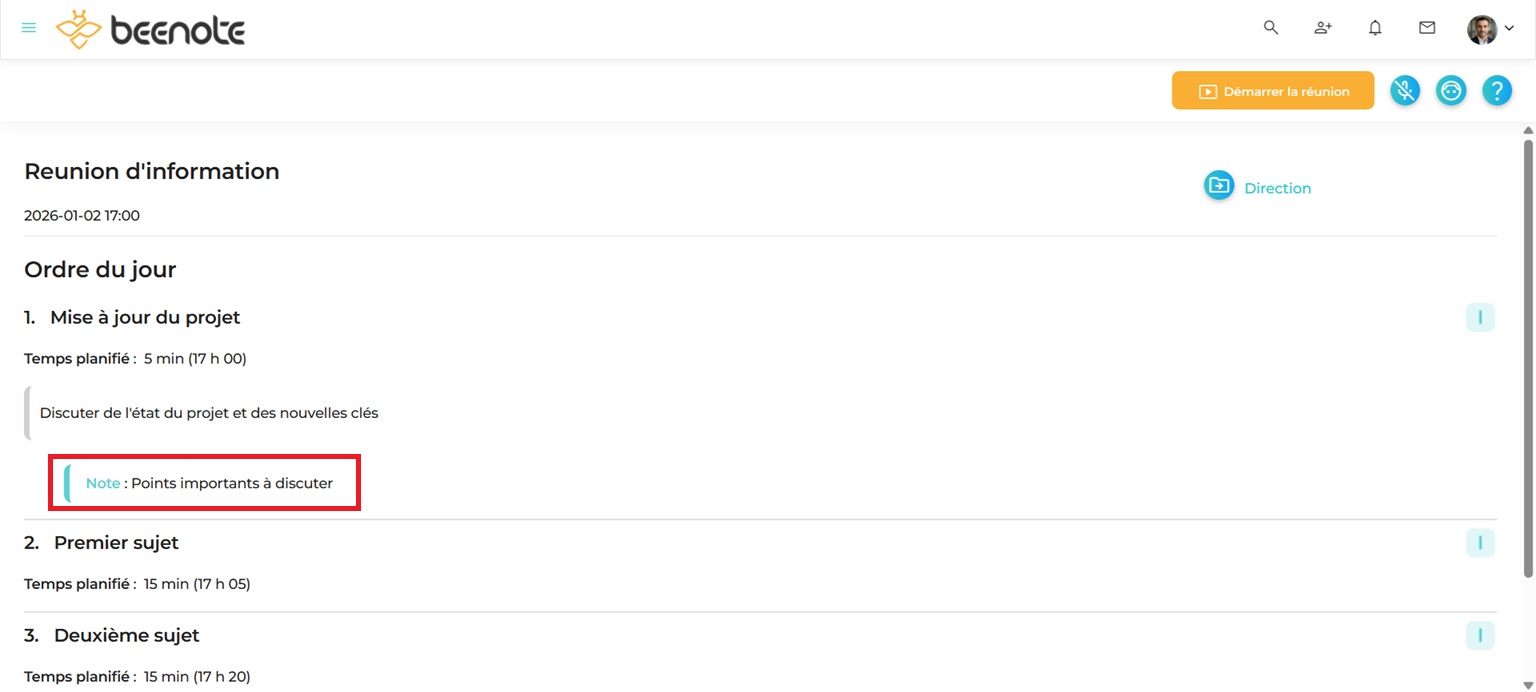 Dans cet exemple, nous avons décoché la note Annonce nouveau poste de directeur. La note en question n’est donc pas visible lors de la consultation de l’ordre du jour publié avant la réunion. Nous voyons seulement la note qui était cochée.