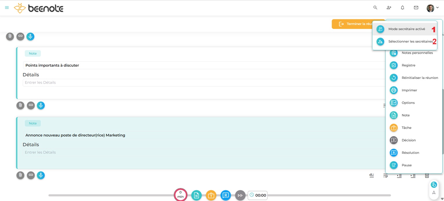 Le mode secrétaire durant la réunion