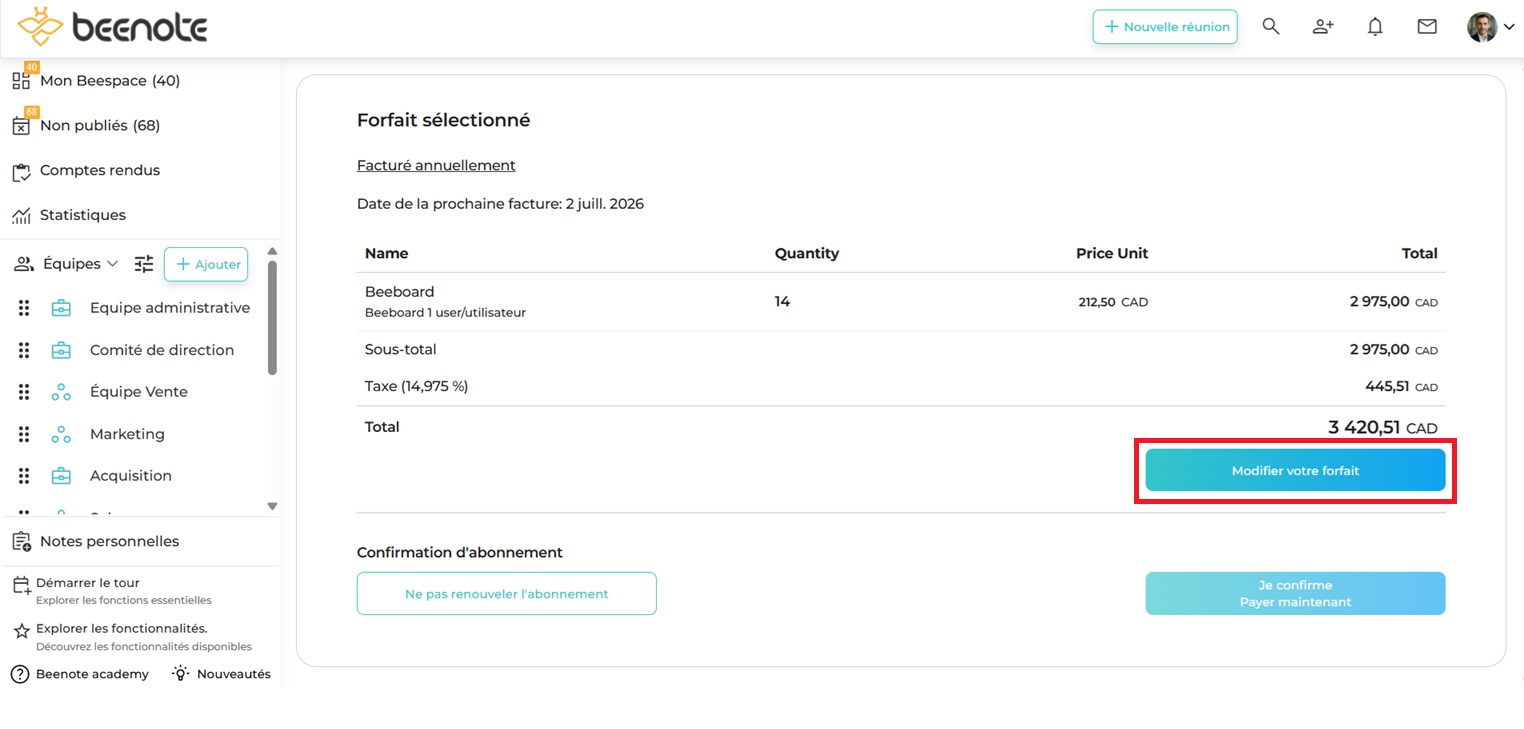 2. Si vous ne disposez pas encore d’abonnement à Beenote, vous serez redirigé vers l’onglet Choisissez un forfait.
