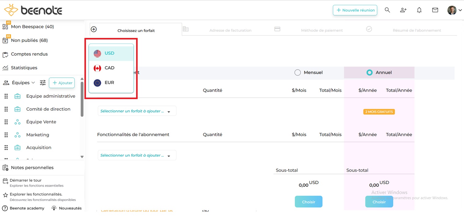 Dans ce cas, Beenote sélectionne une devise par défaut, mais vous pouvez modifier votre choix selon vos besoins : CAD (canadiennes), USD (américaines) ou EUR (européennes)