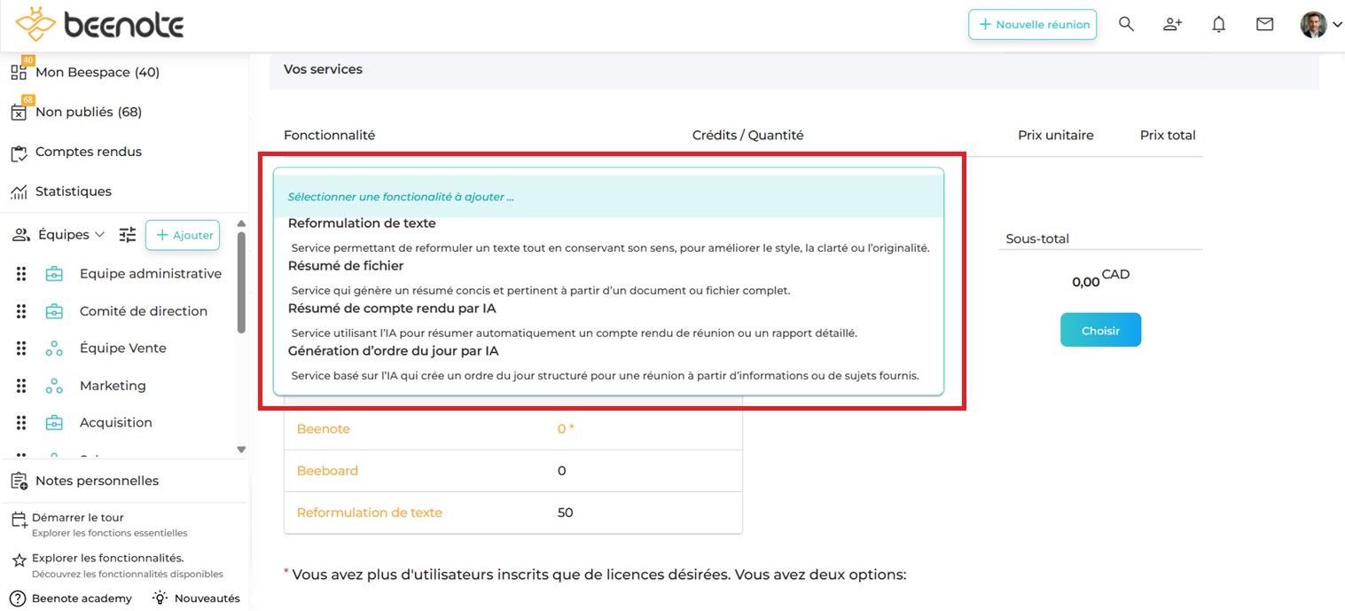N.B: Seuls le gestionnaire de compte et l’administrateur peuvent acheter les fonctionnalités IA.