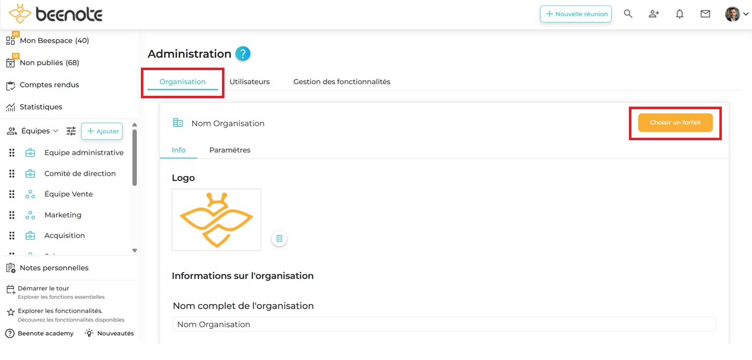 1. Dans l’onglet Organisation, cliquez sur le bouton Choisir un forfait.