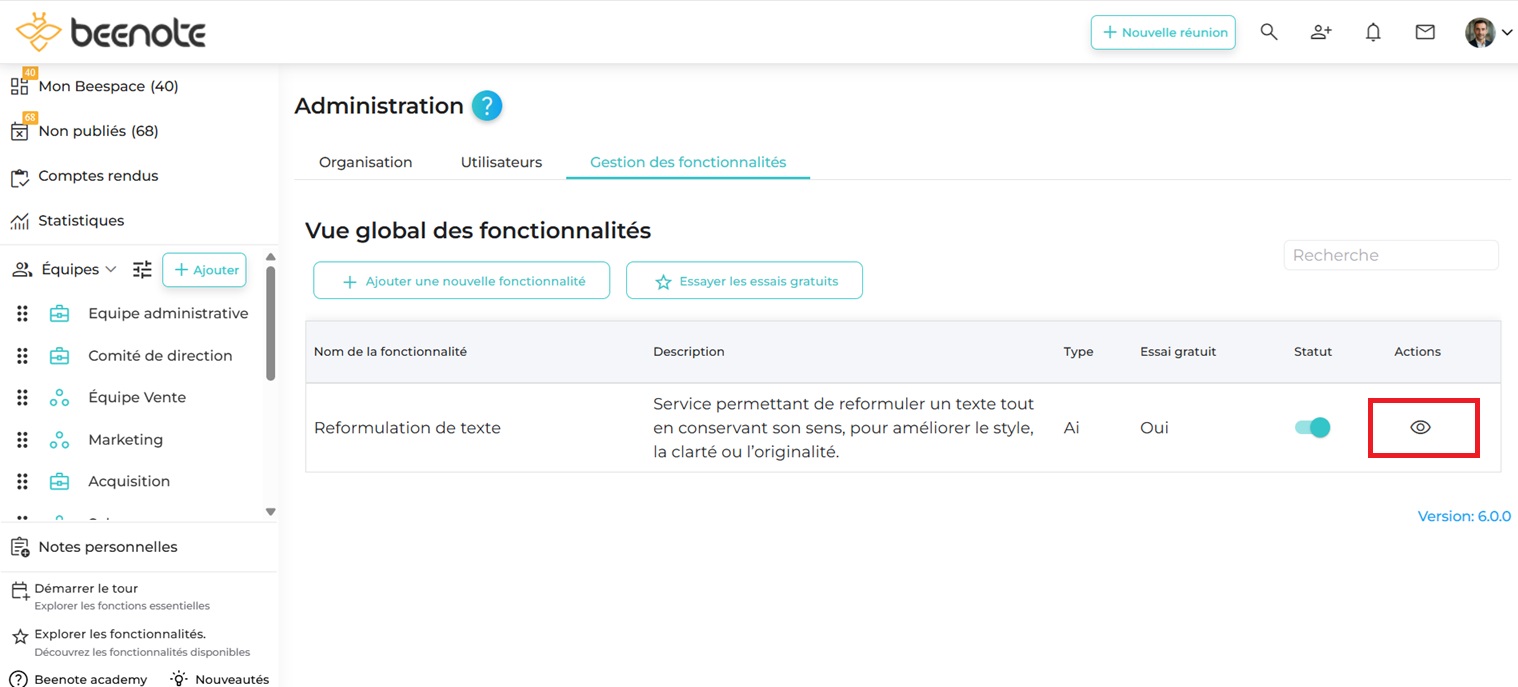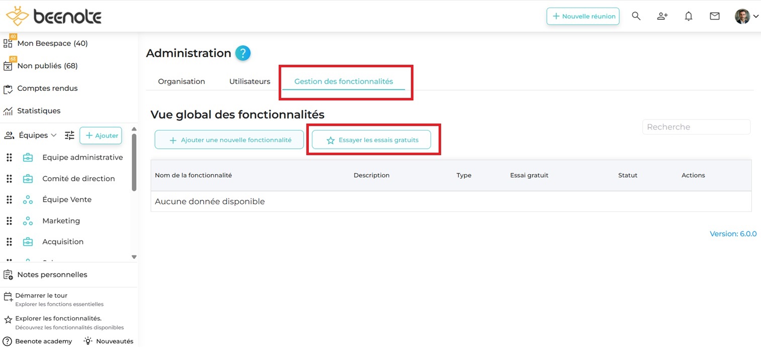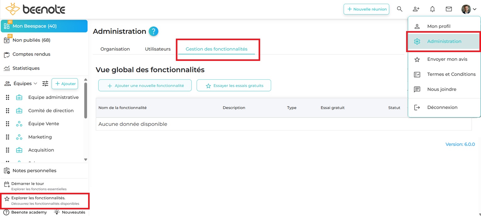 Assurez-vous d’être dans la page Administration et l’onglet Gestion des fonctionnalités de Beenote.