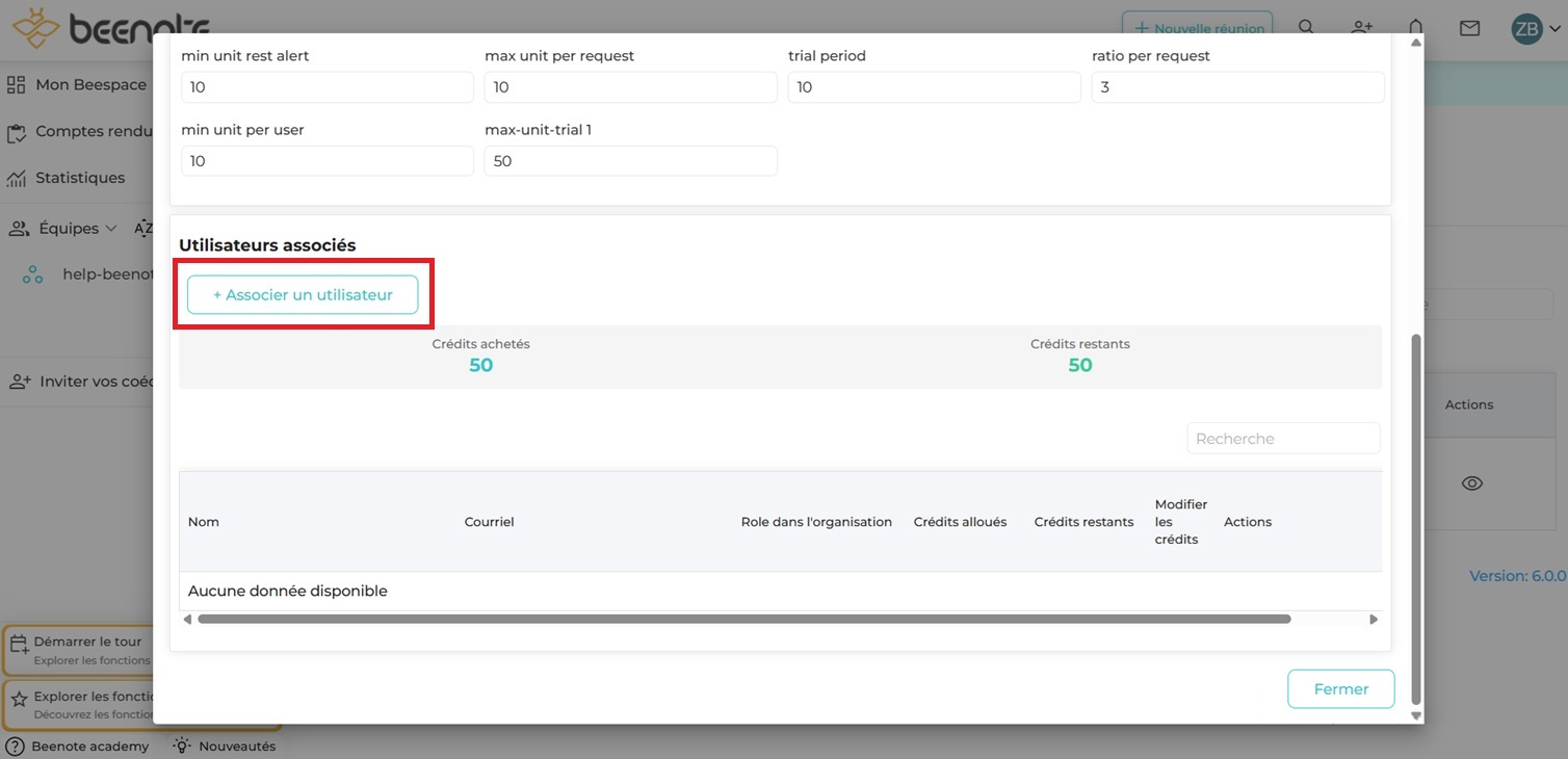 6. En bas de la fenêtre ouverte, cliquez sur Associer un utilisateur afin de sélectionner les utilisateurs qui pourront tester cette fonctionnalité IA.