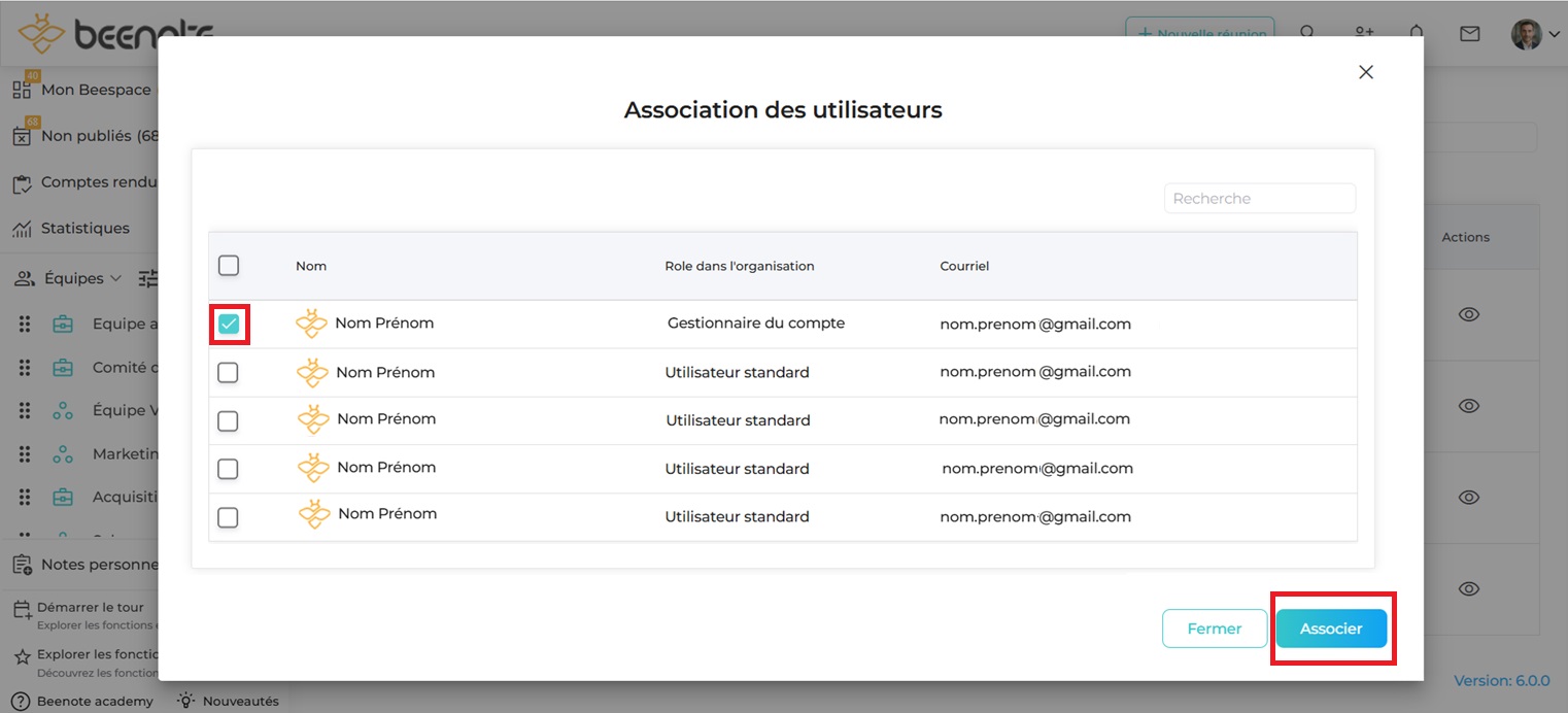7. Cochez les utilisateurs souhaités, puis cliquez sur le bouton Associer.