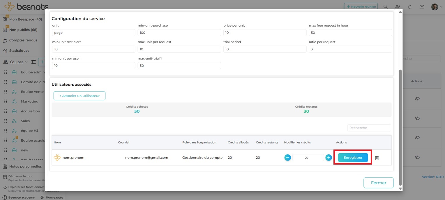 8. Attribuez le crédit souhaité à chaque utilisateur dans le champ Modifier les crédits, puis cliquez sur le bouton Enregistrer.