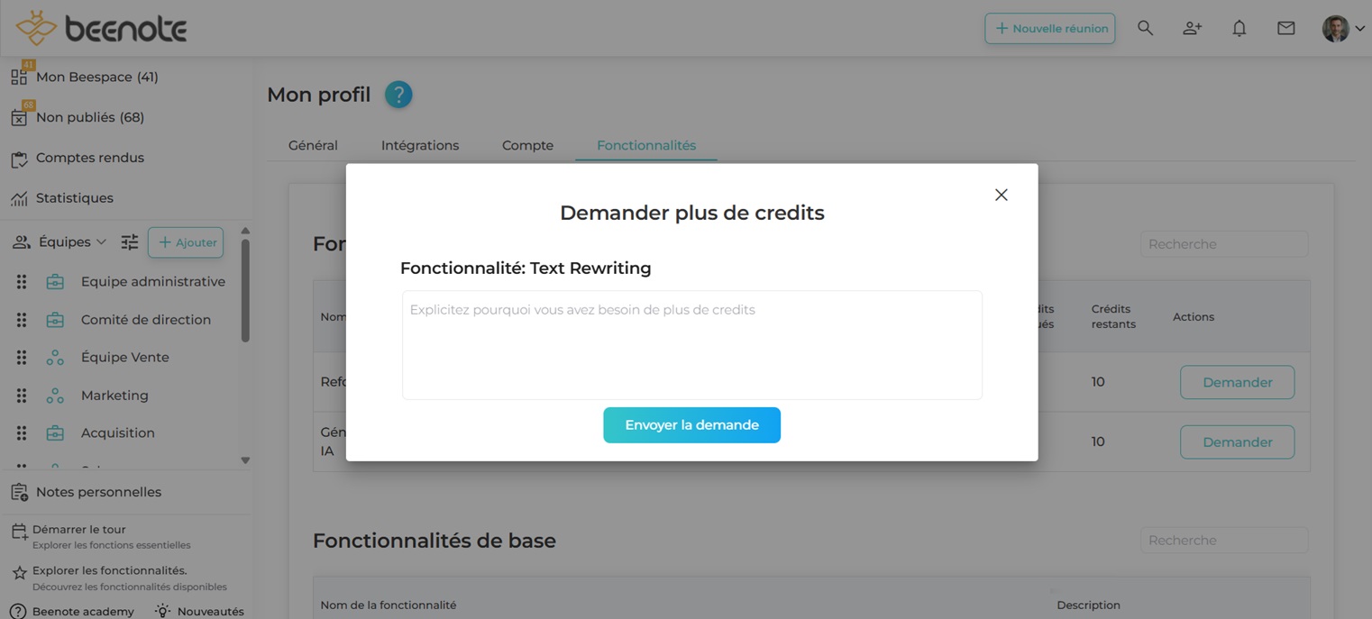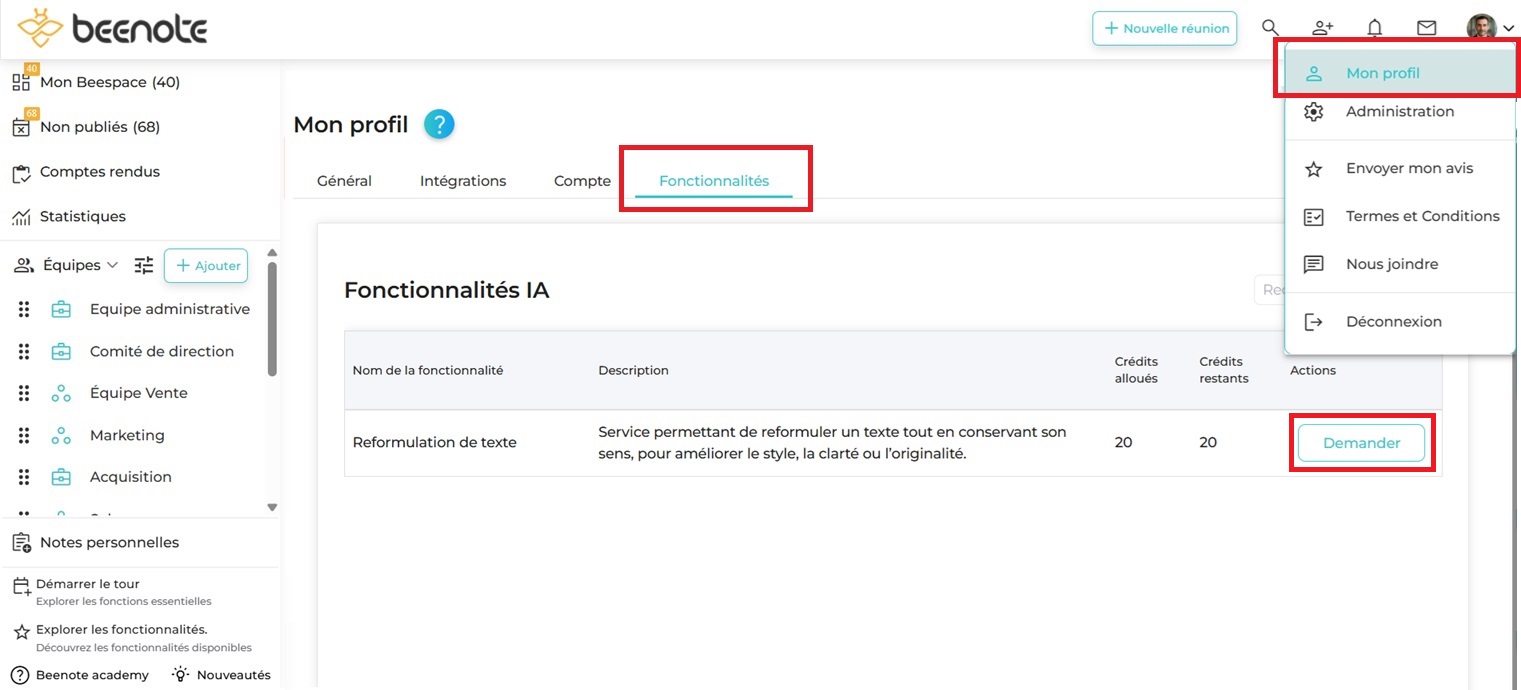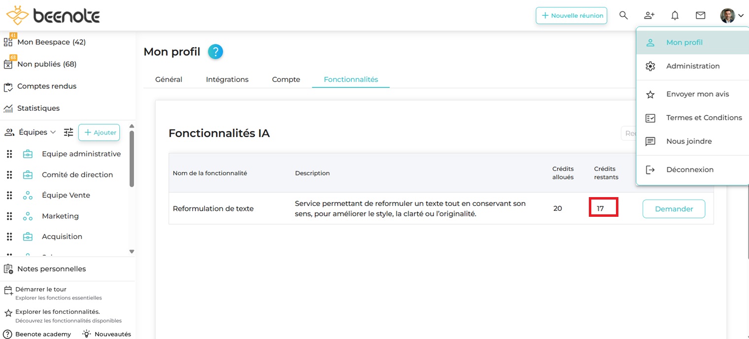 5. Enfin, revenez sur Mon profil et cliquez sur l’onglet Fonctionnalités pour contrôler les crédits restants de la fonctionnalité IA après chaque utilisation.