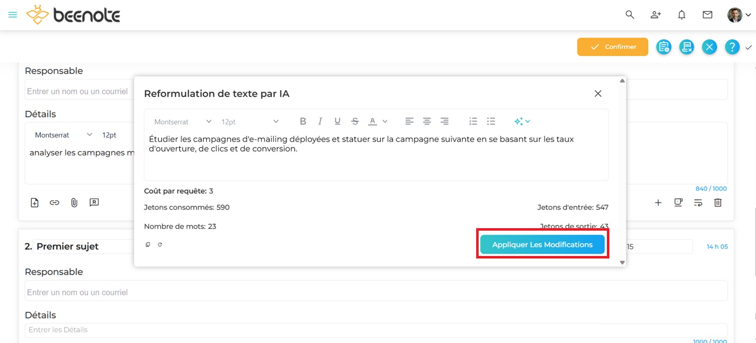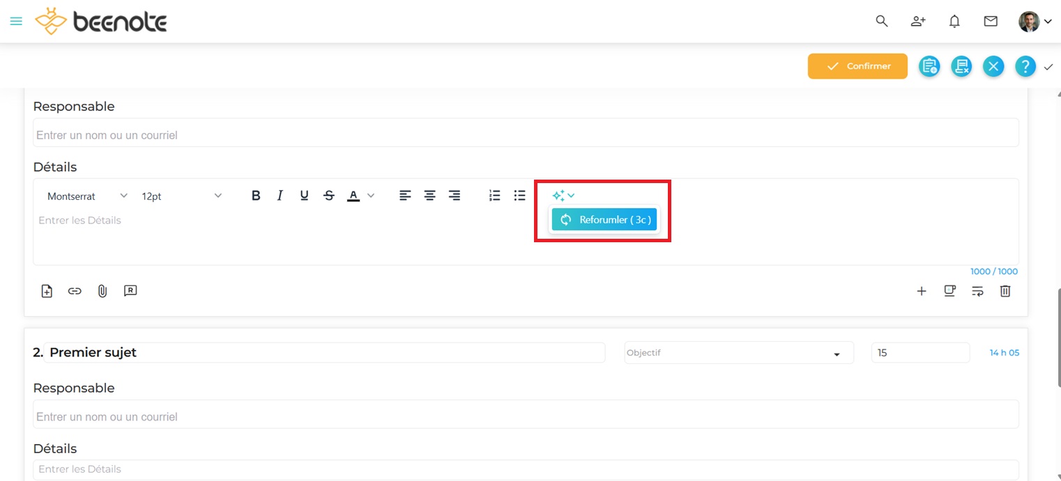 3. La fonctionnalité IA Reformulation de texte peut être utilisée dans n’importe quel champ texte de l’application Beenote.