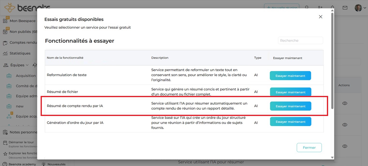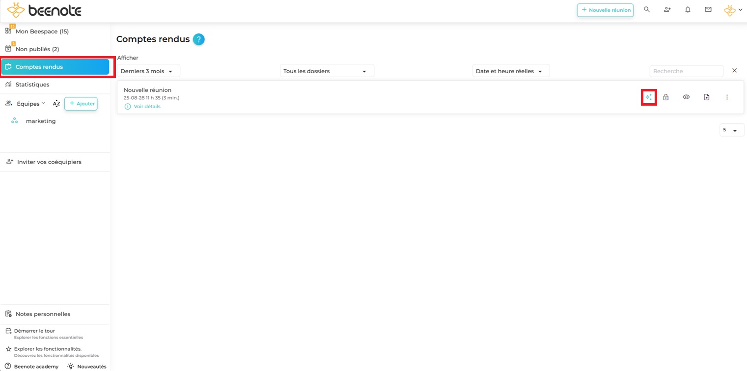 3. Pour utiliser la fonctionnalité IA Génération d’ordre du jour, ouvrez le menu Comptes rendus et cliquez sur l’icone du compte rendu souhaité.