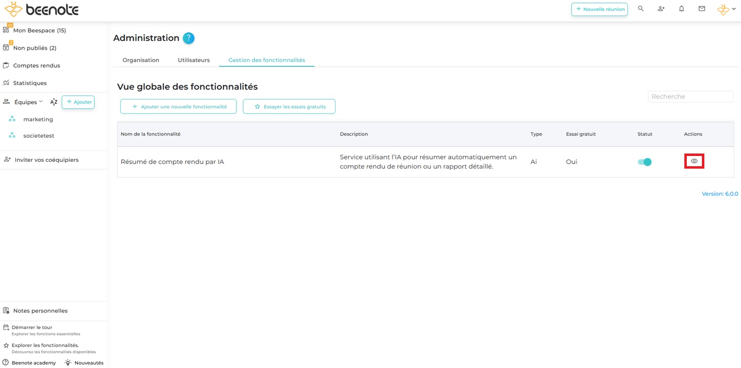 Assurez-vous d’être dans la page Administration et l’onglet Gestion des fonctionnalités de Beenote.
