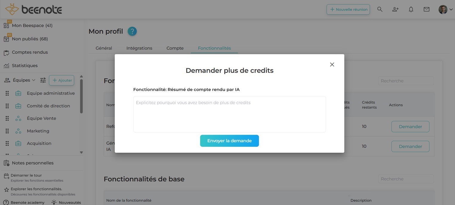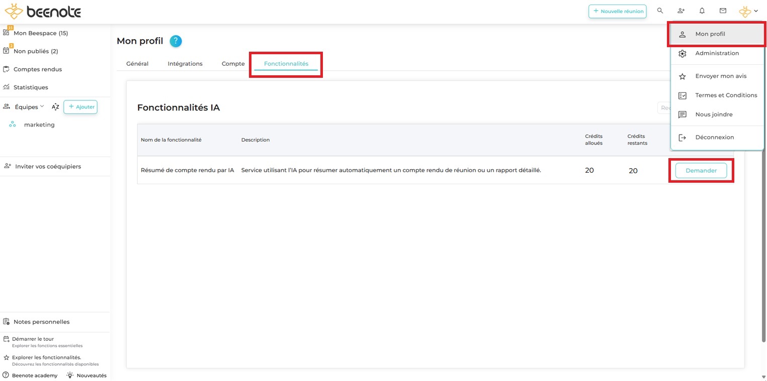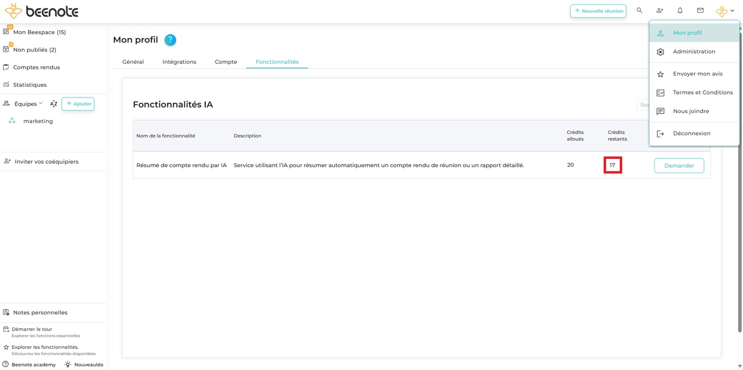6. Enfin, revenez sur Mon profil et cliquez sur l’onglet Fonctionnalités pour contrôler les crédits restants de la fonctionnalité IA après chaque utilisation.