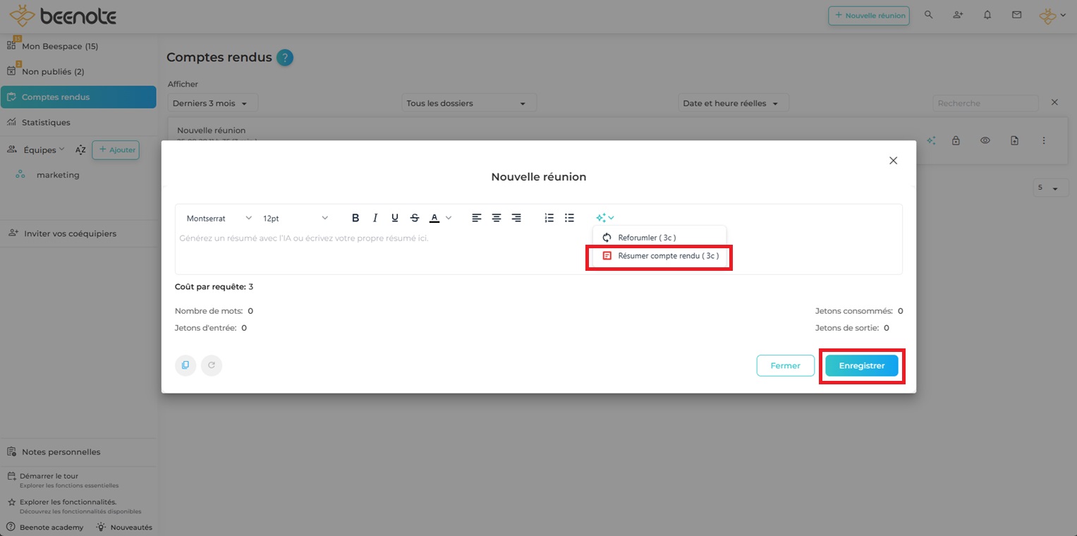 4. Puis, cliquez sur le bouton Résumer Compte rendu dans la fenêtre qui s’ouvre afin de générer automatiquement le résumé par IA.