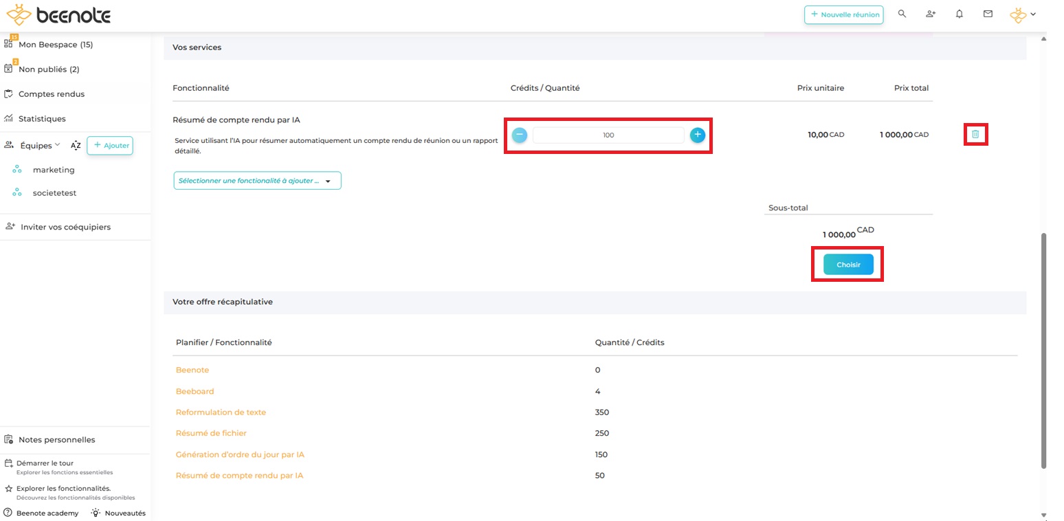 3. Dans l’onglet Choisissez un forfait, cliquez sur Sélectionner une fonctionnalité à ajouter et choisissez la fonctionnalité IA que vous souhaitez acheter.