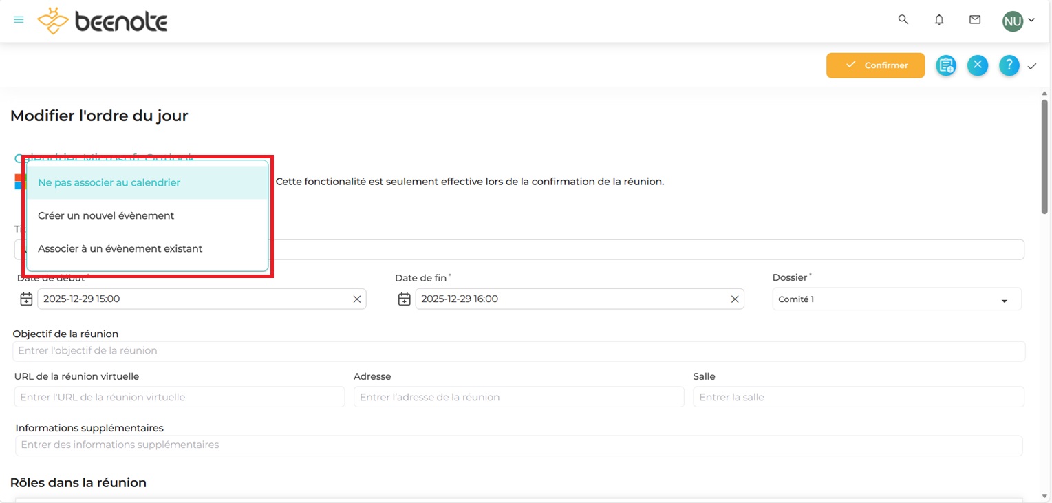 Lorsque vous choisissez de Créer un nouvel évènement, votre réunion s’ajoutera automatiquement à votre calendrier à la confirmation de l’ordre du jour.